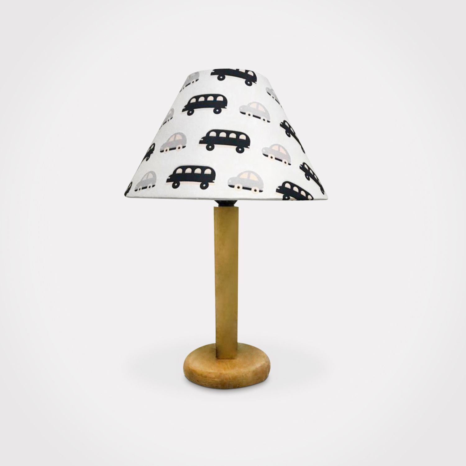 Com base feita em madeira e cúpula em acetato revestida de tecido com estampa de carrinhos, a peça se destaca por sua estabilidade e por proporcionar uma luz suave e homogênea no ambiente.