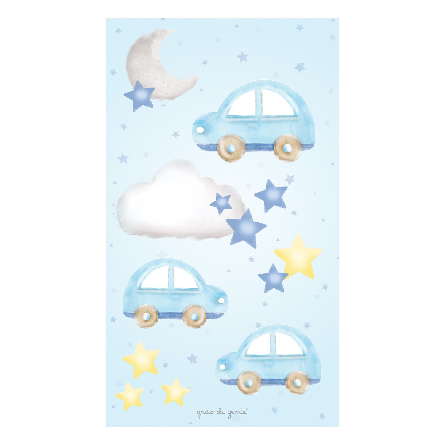 Adesivo de Parede 3 Carrinhos, Estrelinhas, Nuvem e Lua
