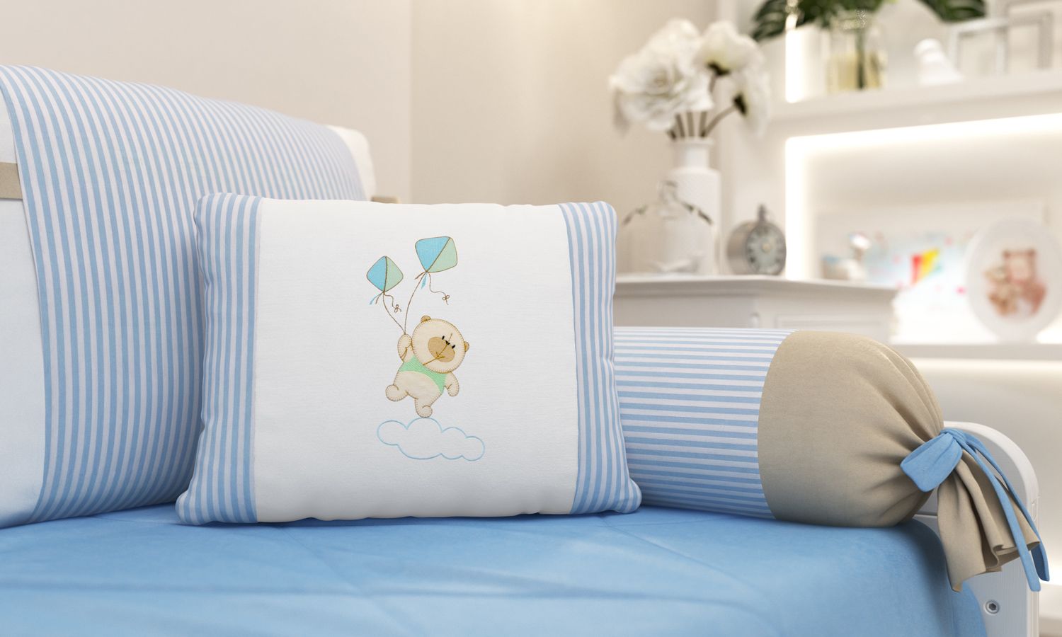 Nino é um ursinho super fofo, que nasceu no estúdio de criação da Grão de Gente para colorir e alegrar a decoração do quarto de bebê do seu menino! A Almofada Bordada Nino e a Pipa traz esse personagem sapeca voando acima das nuvens com as suas pipas, além das duas faixas com estampa listrada azul.