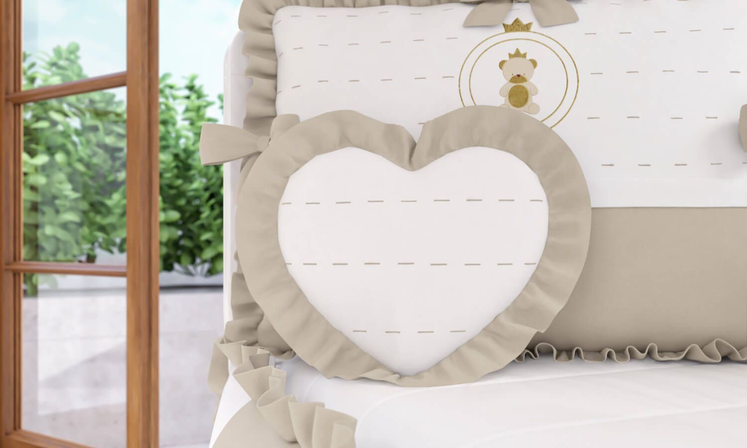 Apaixonante, a Almofada Coração Urso Teddy Realeza é puro amor e vai se destacar na mais perfeita decoração do quarto de bebê! Conquistando as mamães clássicas, a peça transparece bom gosto e requinte numa linda combinação: o formato lúdico de coração, bordado que faz referência ao ponto alinhavado e o sofisticado babado em azul-marinho, que contorna todo o modelo. O tecido macio e enchimento fofinho 100% fibra de poliéster permitem apoio confortável e o aconchego necessário para cochilos. Aposte nesse tema e confira as outras Almofadas Decorativas!