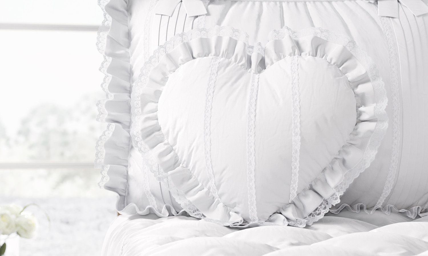 Almofada Coração com Babado e Renda Branca 30cm