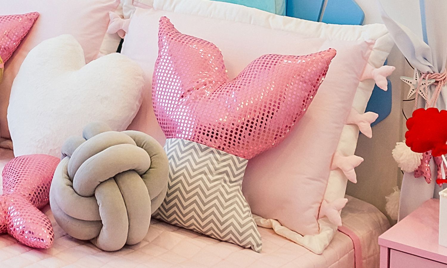 Moderna e charmosa! A Almofada Decorativa Sereia Rosa Chevron vai conquistar toda a família que sonha com uma decoração feminina e criativa para o quarto de bebê ou infantil da princesa. Essa almofadinha tem formato lúdico e criativo de cauda de sereia com estampa chevron cinza e nadadeiras cor de rosa com paetê. Cheia de brilho e enchimento fofinho, essa foi a escolha da atriz mirim Giovanna Alparone para o quarto Sereia Aquática.