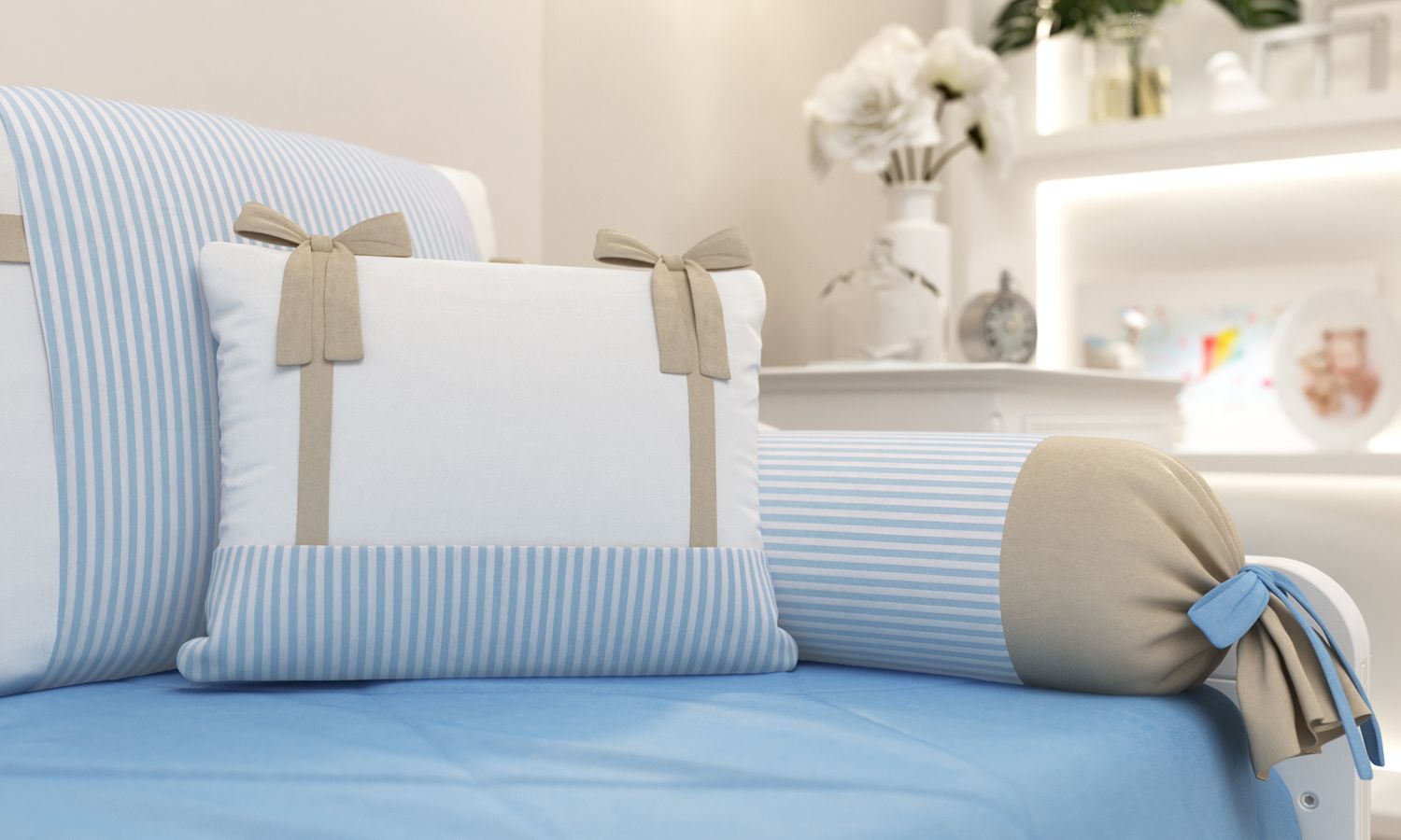 Quer mais conforto, originalidade e estilo? Acrescente almofadas à decoração do quarto de bebê! Essa dica vale para ambientes de todos os tamanhos e você encontra os mais variados modelos na Grão de Gente. Essa charmosa Almofada Laços faz parte da Coleção Nino e a Pipa, uma novidade exclusiva para mamães que apostam na tranquilidade das cores suaves e no bom gosto das listras.