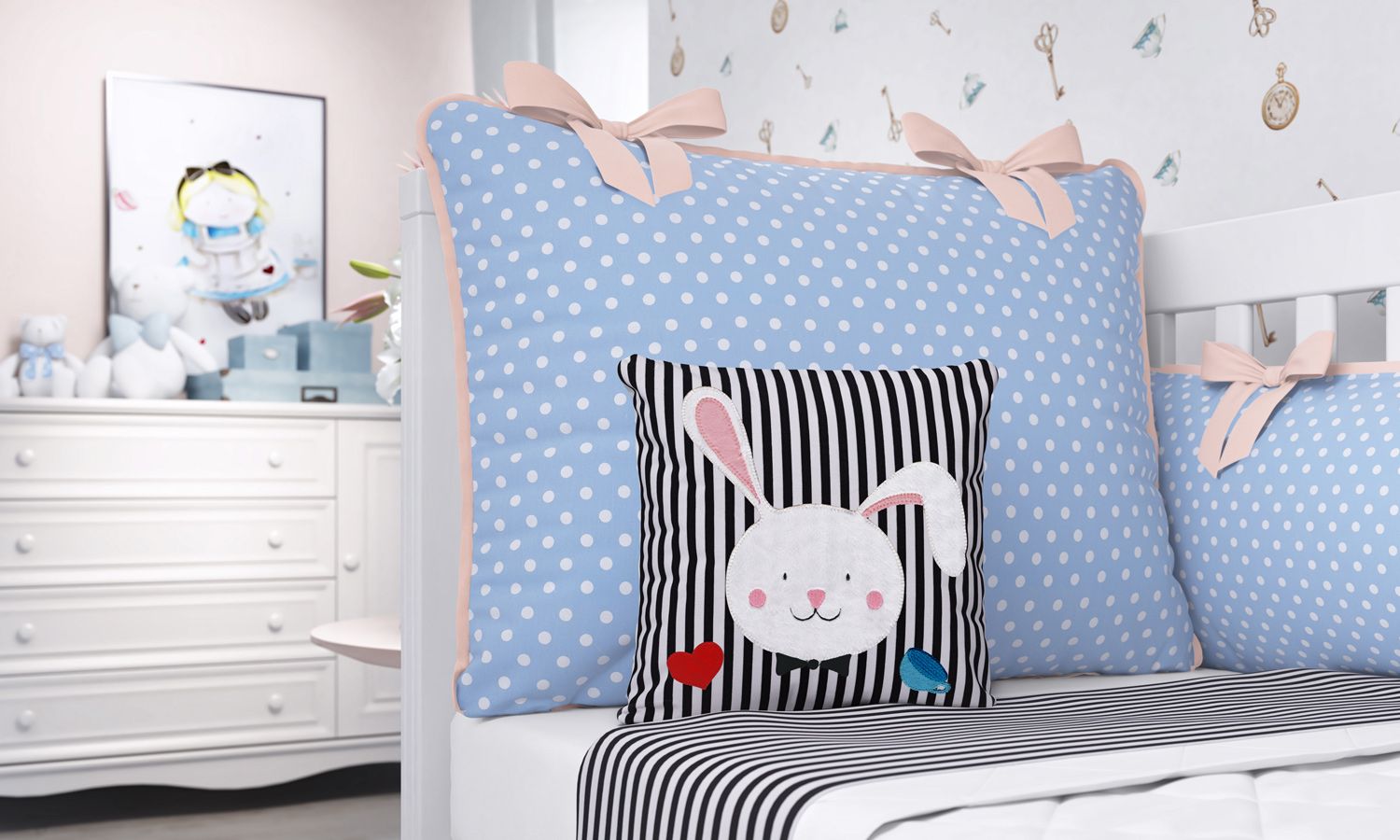 A Almofada Coelho é pura diversão e vai transformar o quarto de bebê no país das maravilhas! O estilo lúdico que tanto diverte os meninos e as meninas é perfeito para ilustrar as mais divertidas histórias, enquanto o enchimento fofinho proporciona um apoio confortável. Numa fina confecção, a estampa de listras serve de base para três belos bordados: um simpático coelhinho em tamanho grande, uma xícara azul e um coração vermelho de arrancar suspiros. Você pode usar o acessório em vários temas de quartinho para enfeitar o berço, a cama babá, poltronas e até tapetes.