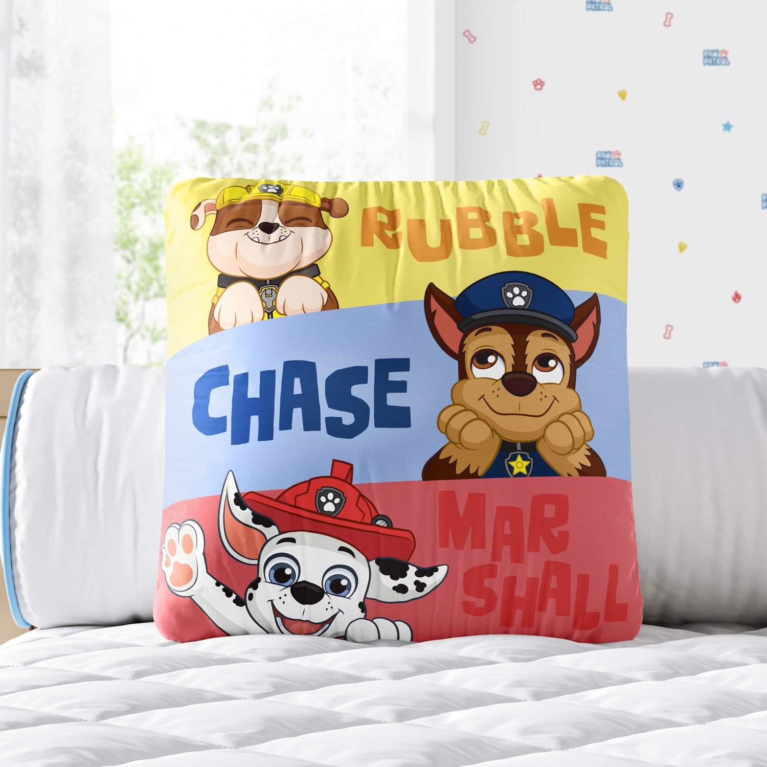 Confeccionada em tecido de toque suave e enchimento macio, a peça encanta com a estampa oficial dos cãezinhos Chase, Rubble e Marshall.