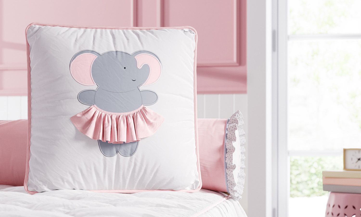A Almofada Quadrada Elefantinha bordada é pura meiguice e elegância! Com uma charmosa elefanta bailarina bordada e uma linda saia rosa, essa almofadinha decorativa tem um efeito 3D, devido ao tecido aplicado no bordado. O acabamento em cordonê rosa completa o design com delicadeza. Linda sugestão para decorar o quarto de bebê com aconchego. Além de enfeitar, pode ser usada para estimular o desenvolvimento da pequena com suas diferentes texturas.