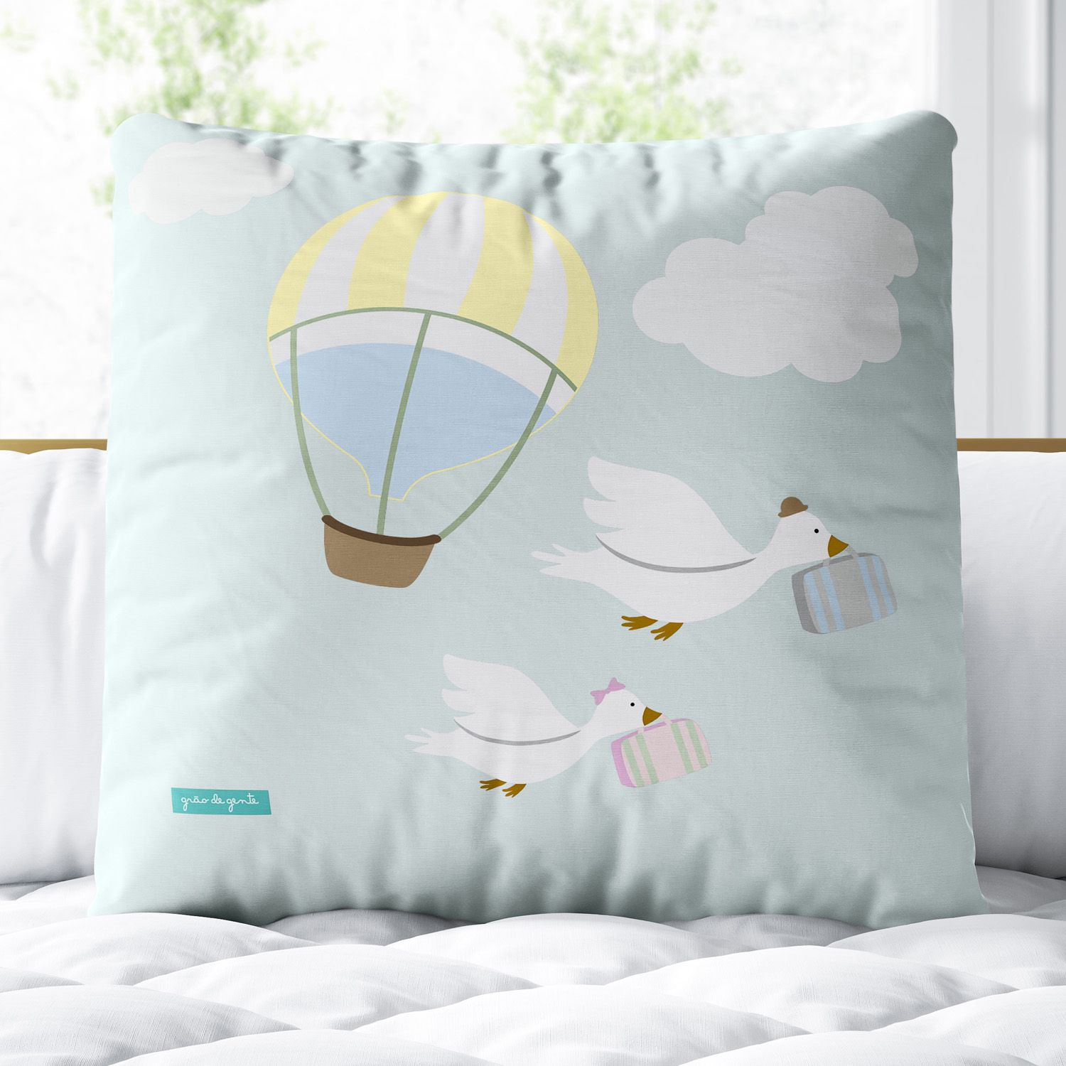 Prepare-se para altas aventuras! A Almofada Quadrada Patinhos e o Balão é um produto exclusivo da Grão de Gente, a principal marca de enxoval e quarto de bebê da América Latina. Nossa almofadinha traz estampas exclusivas em alta definição com três temas queridinhos para compor a decoração: Balão, nuvem e bichinhos! Ela já vem com enchimento, o tecido não amassa e a estampa sublimada é feita com tinta atóxica (a base de água) e toque zero, mais confortável para os pequenos.