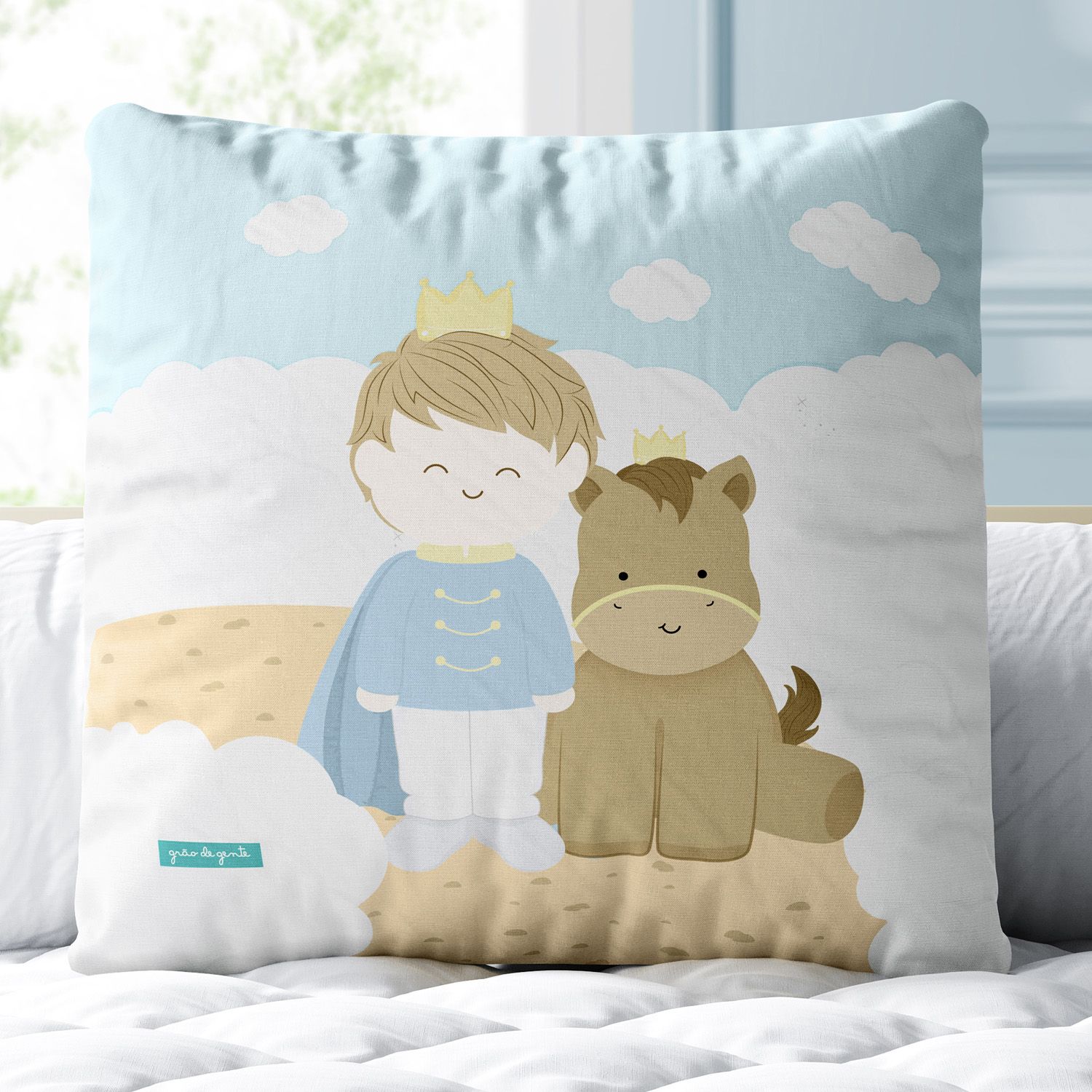 A Almofada Quadrada Príncipe e o Cavalinho é um produto exclusivo da Grão de Gente, a principal marca de enxoval e quarto de bebê da América Latina. Essa almofadinha encantadora traz uma estampa em alta definição para compor a decoração com aconchego e originalidade. Ela já vem com enchimento, o tecido não amassa e a estampa sublimada é feita com tinta atóxica (a base de água) e toque zero, mais confortável para os pequenos.