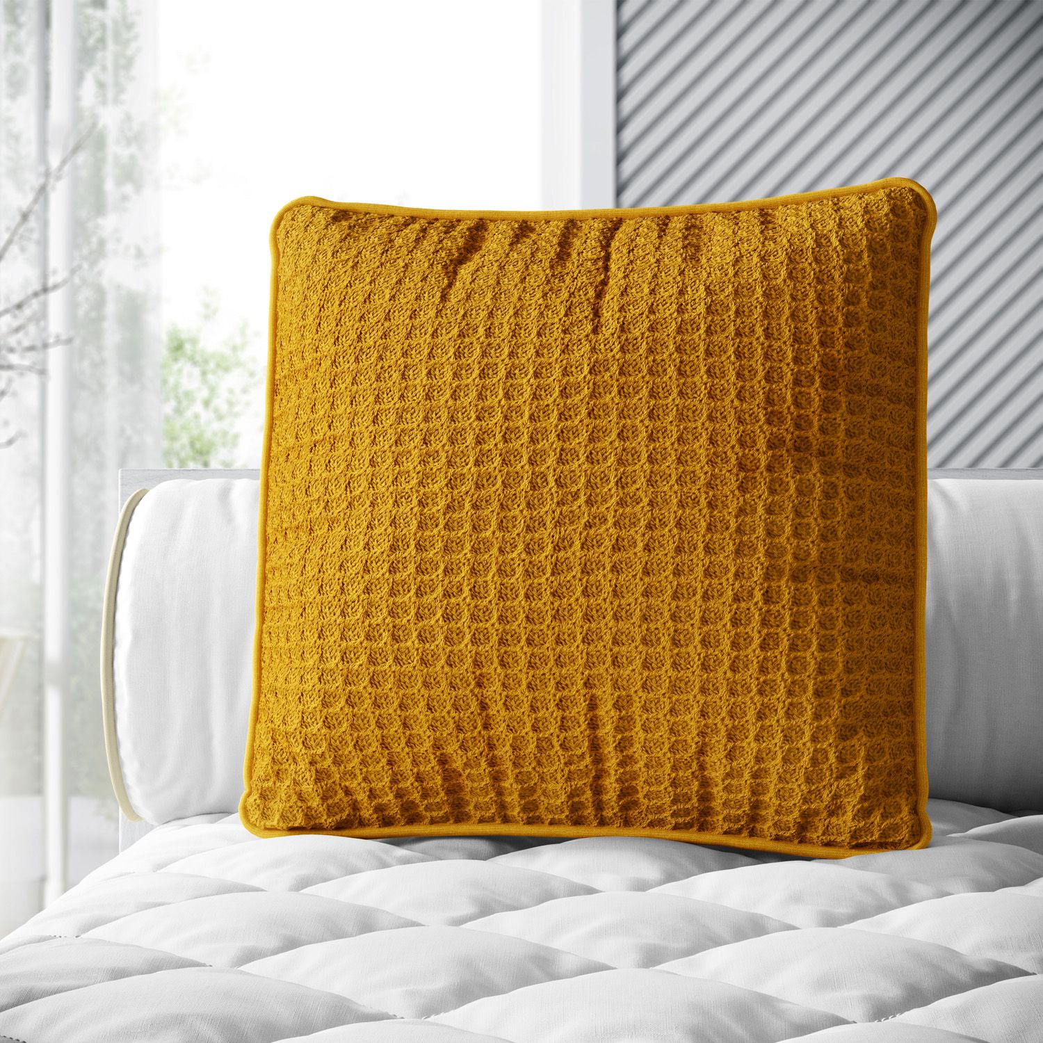 A Almofada Quadrada Tricot Colmeia Amarelo Mostarda é uma escolha aconchegante e contemporânea para o quarto de bebê ou infantil. Esse tom terroso de amarelo fechado é uma super tendência e vai adicionar personalidade ao ambiente! A almofadinha decorativa com viés cordonê, que emoldura a peça, já vem com enchimento fofinho e combina com diversos temas e estilos de decoração!