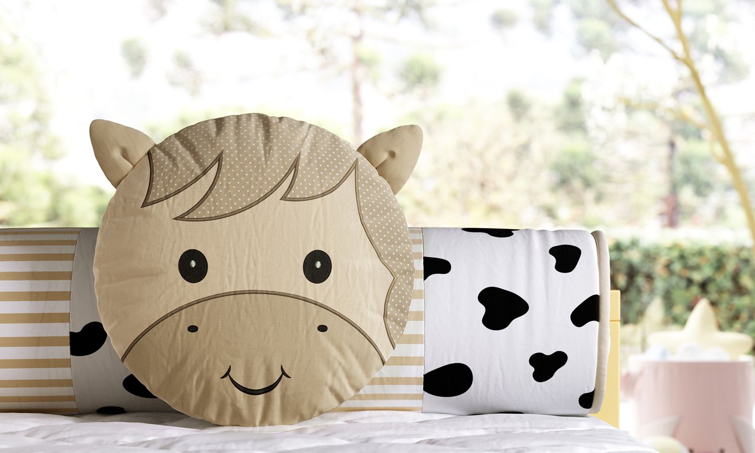 O cavalinho da Fazendinha é representado com bordados pela charmosa Almofada Redonda Amiguinho Cavalinho 30cm.
