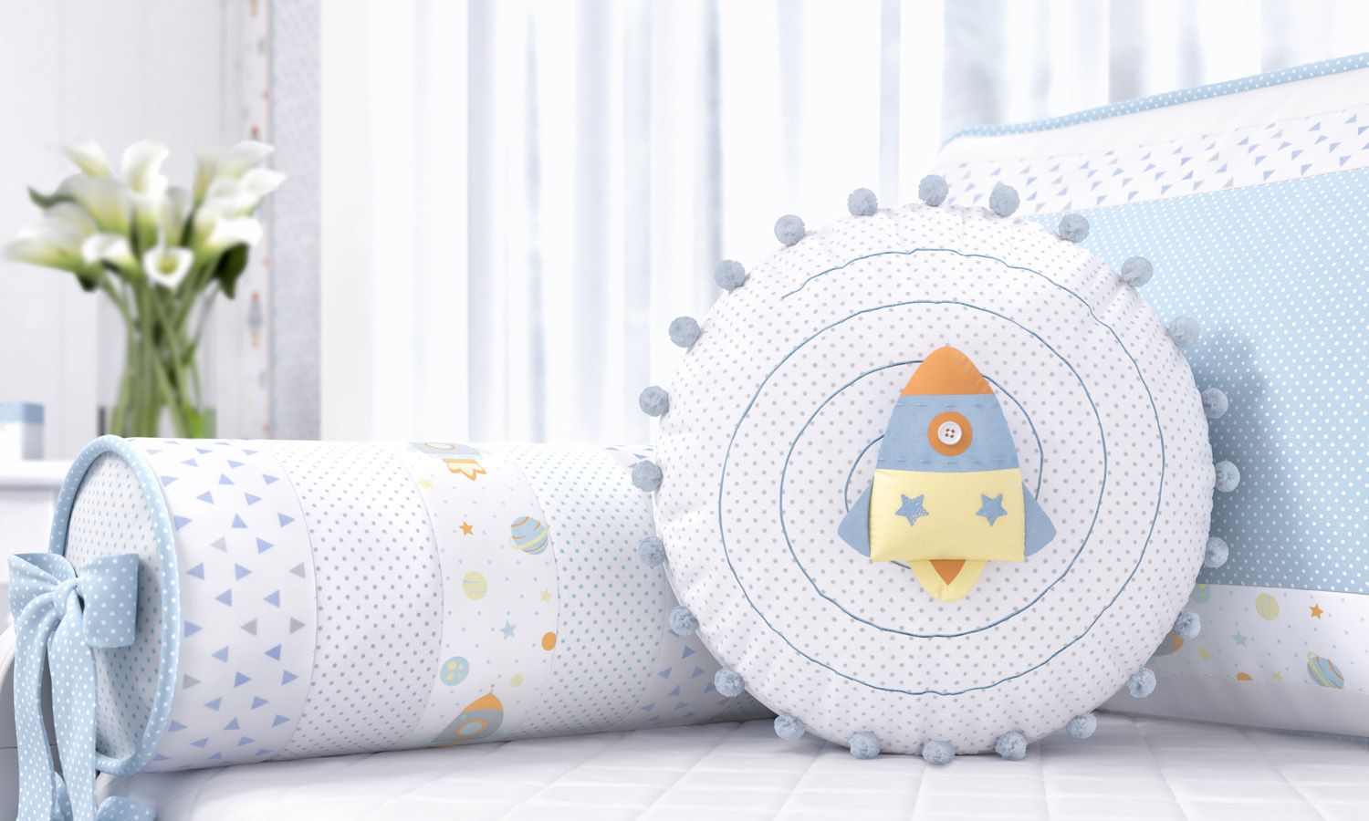 Os detalhes dessa almofada são encantadores, o foguetinho fixado no centro da almofada dá o charme que está presente em todos os produtos desse amorzinho de coleção.