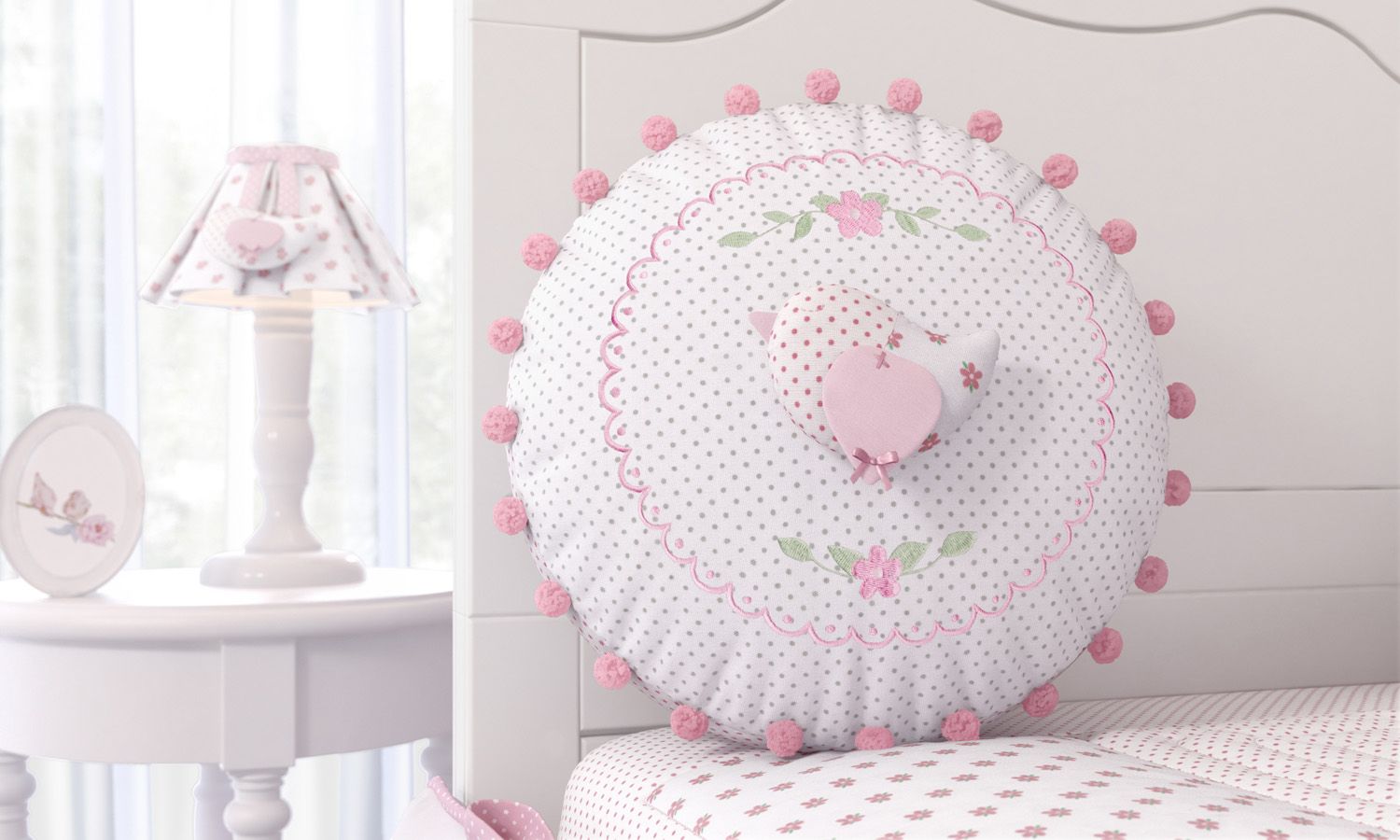 A beleza da Almofada Patchwork envolve qualquer quarto de bebê com estampas românticas, bordados de flores e os mais deslumbrantes detalhes! Ela chama atenção pela combinação bem feminina, capaz de ditar a decoração do quarto de bebê com bolinhas estampadas por todo acessório, bordados exclusivos de ramos florais e até mesmo um passarinho almofadado e lindamente decorado. E ainda não acabou! O formato arredondado da peça ganhou um super destaque com a passamanaria pompom rosa, que contorna todo o acessório e finaliza o modelo com extremo bom gosto. Você pode usá-lo para enfeitar a cama babá, poltronas e tapetes ou até mesmo servir de apoio para um tranquilo cochilo. Agora que a Almofada Quadrada já conquistou o seu coração, confira as Almofadas Decorativas Patchwork para completar o seu sonho cor-de-rosa!