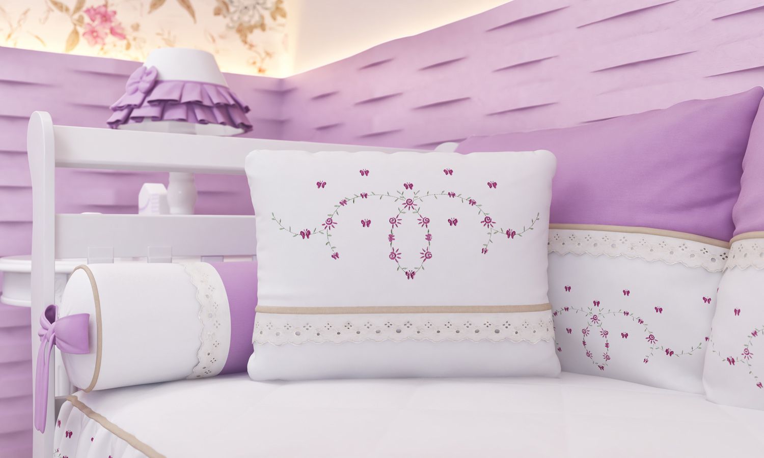 Um gracioso bordado de raminho com flores vai embelezar o cantinho do seu maior amor, enquanto o enchimento fofinho garante o conforto e aconchego da neném.