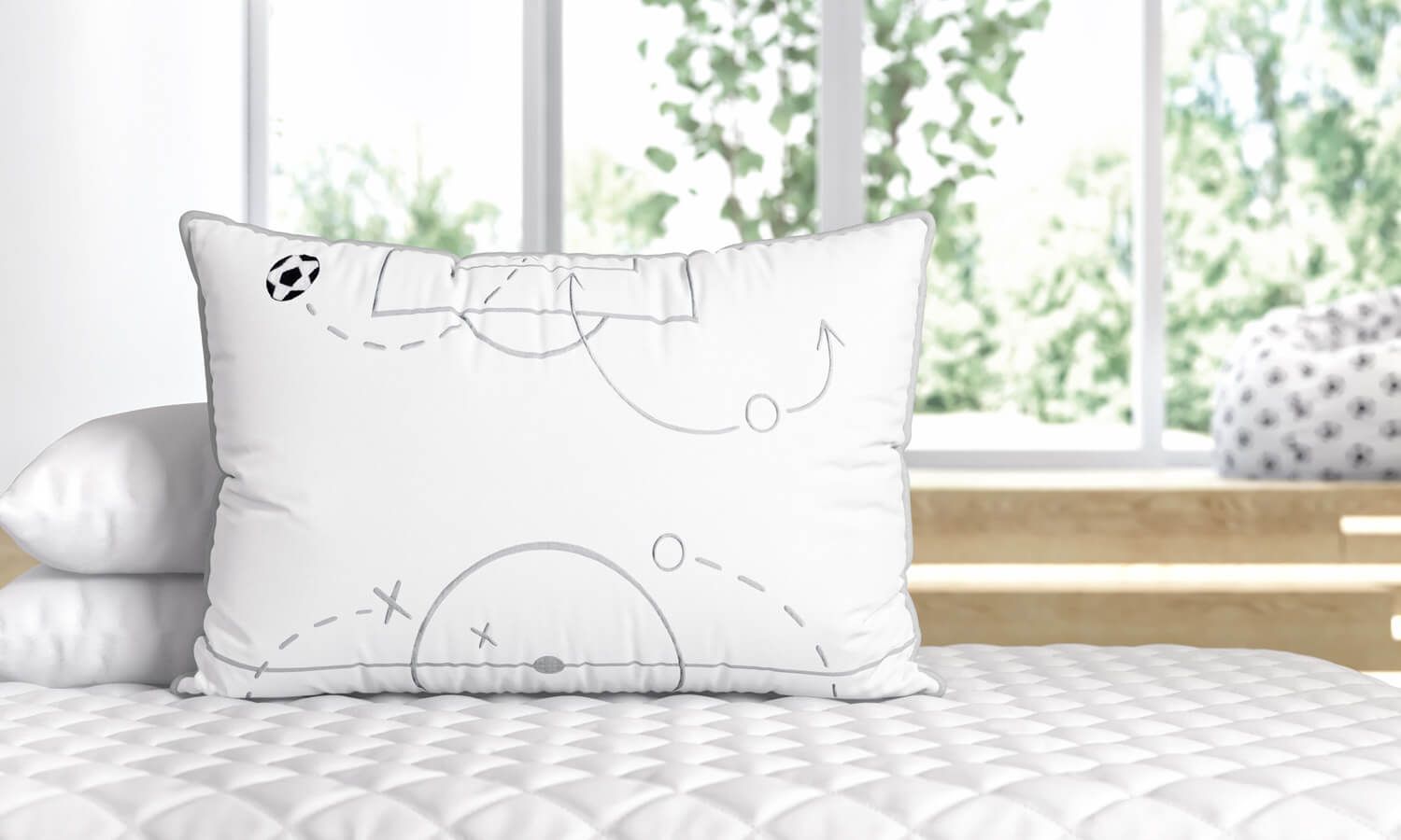 A Almofada Retangular Esquema Tático traz conforto e bem-estar para a cama infantil e toda a estratégia dos esquemas táticos do futebol que conduzem o time até a vitória. O esquema tático define o posicionamento dos jogadores em campo e inspirou a criação dessa mini cabeceira original da coleção futebol.