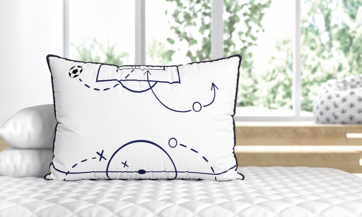 A Almofada Retangular Esquema Tático traz conforto e bem-estar para a cama infantil e toda a estratégia dos esquemas táticos do futebol que conduzem o time até a vitória. O esquema tático define o posicionamento dos jogadores em campo e inspirou a criação dessa mini cabeceira original da coleção futebol.