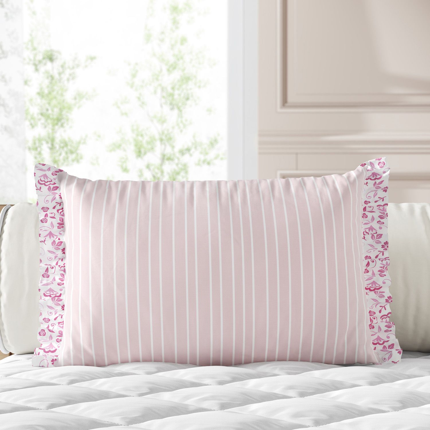 Com a beleza atemporal da estampa floral e o toque contemporâneo das listras em rosa, a peça encanta ainda com o acabamento elegante com babadinhos. Perfeita para criar uma atmosfera romântica e repleta de aconchego no ambiente!
