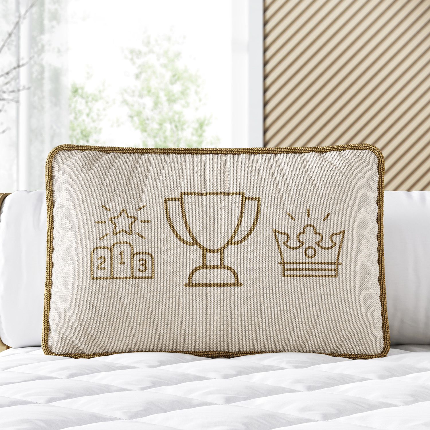 Todo campeão tem seu troféu, e o seu não poderia ficar sem o dele! A Almofada Retangular Tricot Campeão Bege une todo o conforto do tricot com bordados que remetem ao fascinante mundo esportivo, como o pódio, a coroa e destaque para um lindo troféu. Fofinha e versátil, ela é perfeita para abraçar, servir de apoio e decorar o quartinho do seu amor em todas as fases da vida.