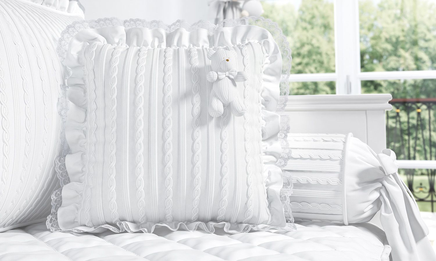 Almofada Ursinho e Rendinha Tricot Luxo Branco 38cm