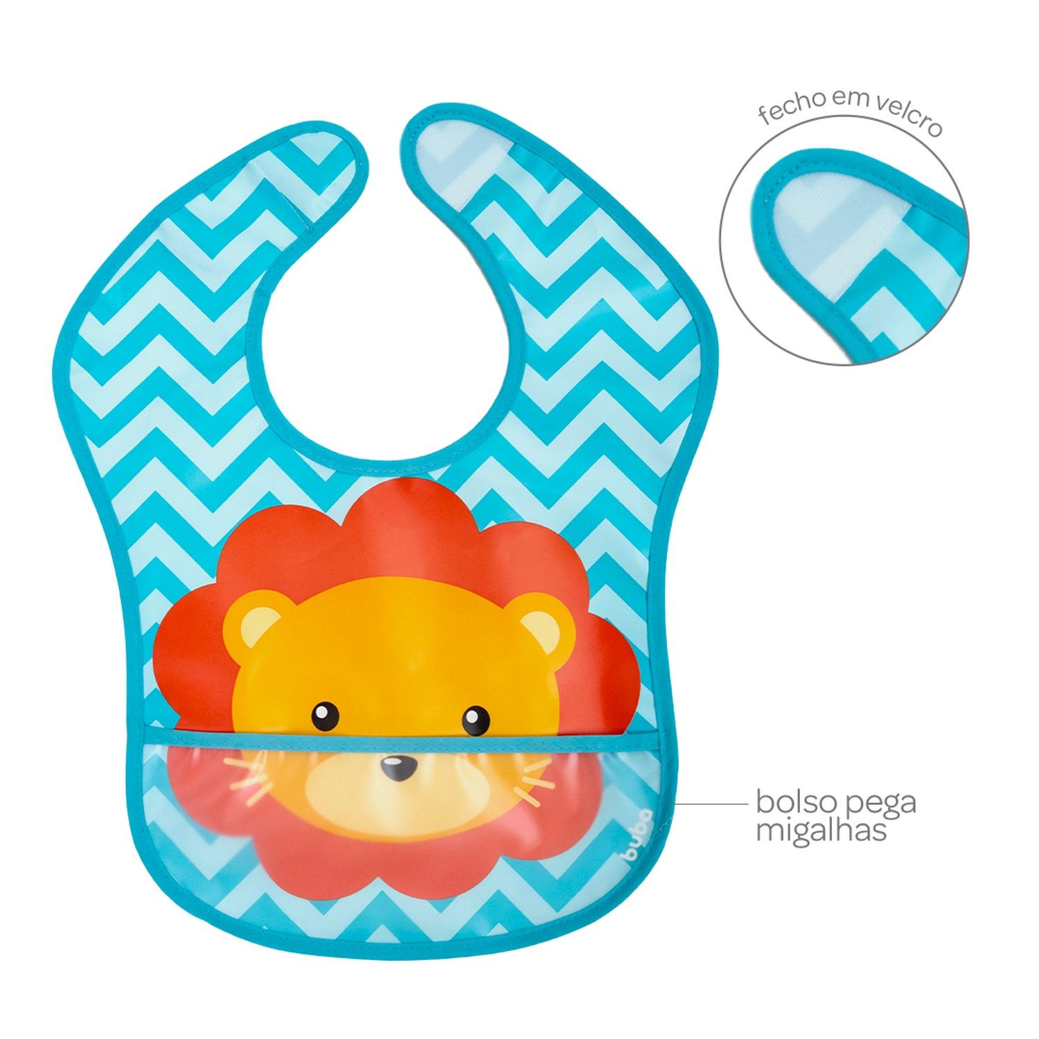 Feito com tecido impermeável, com fecho em velcro e bolso pega-migalhas, o acessório ajuda a manter o bebê sempre limpinho e confortável na hora da alimentação.