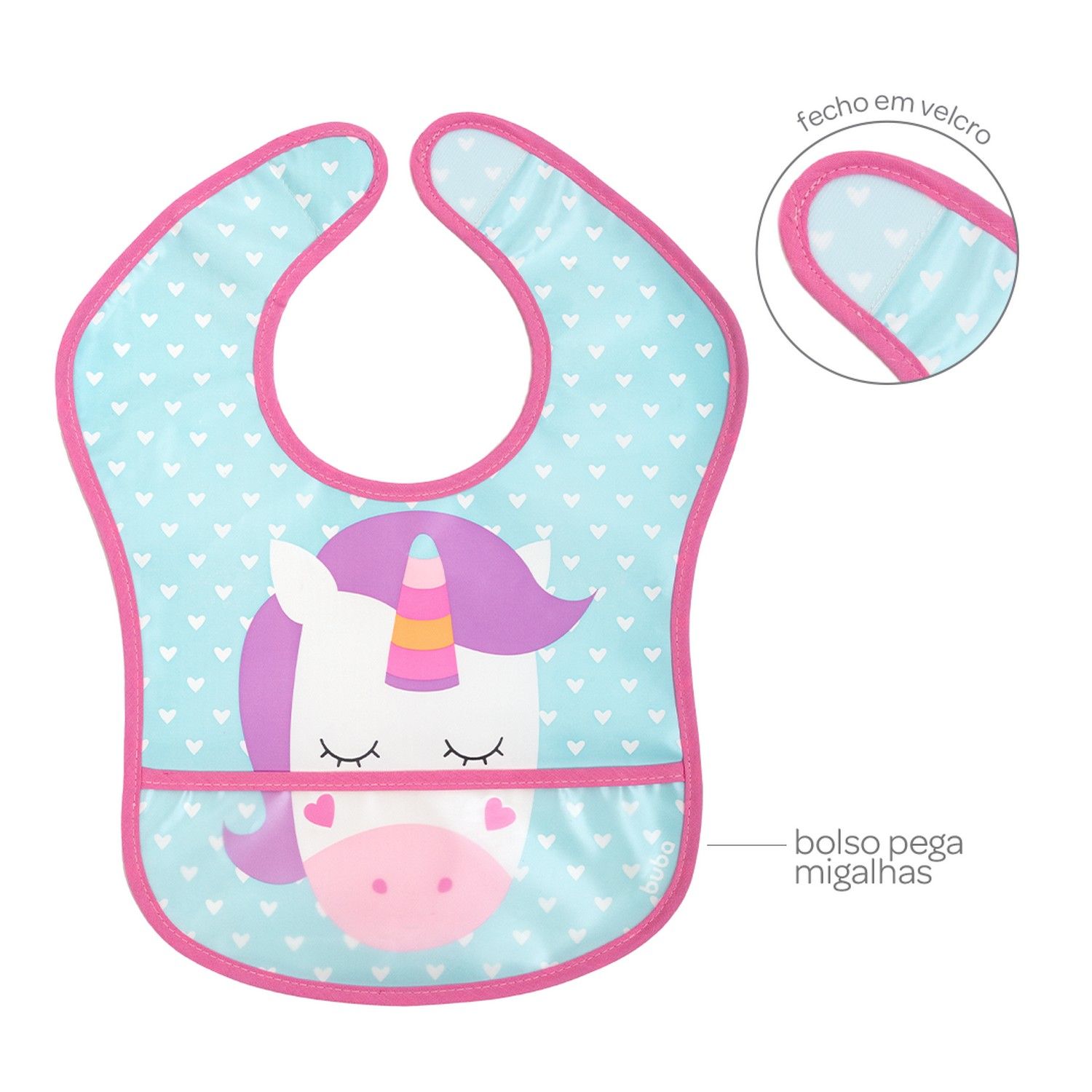Feito com tecido impermeável, com fecho em velcro e bolso pega-migalhas, o acessório ajuda a manter o bebê sempre limpinho e confortável na hora da alimentação.
