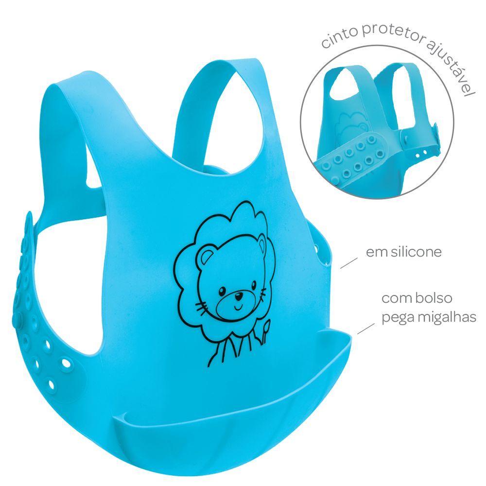 O Babador de Silicone Azul com Cinta Leão Buba é ótimo para seu bebê se alimentar e se sentir confortável, seu material de silicone impede que passe qualquer umidade para a roupinha da criança e seu bolso frontal (pega migalhas) é maravilhoso pois impede que caia tudo sobre o bebê. O babador ainda possui um cinto com regulagem ajustável.