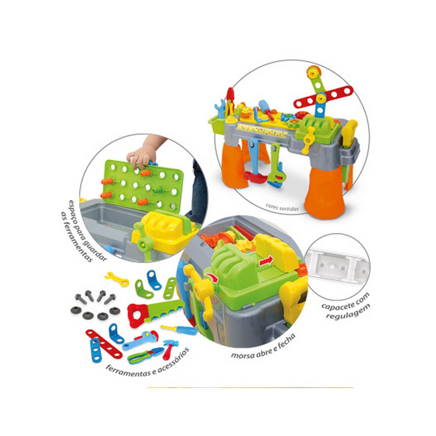 Ao girar a alavanca da morsa, ela abre e fecha de verdade, espaço para guardar as ferramentas, tampa removível e encaixes para os parafusos, e ainda um lindo capacete com regulagem, deixando a brincadeira muito mais real e divertida para seu pequeno.