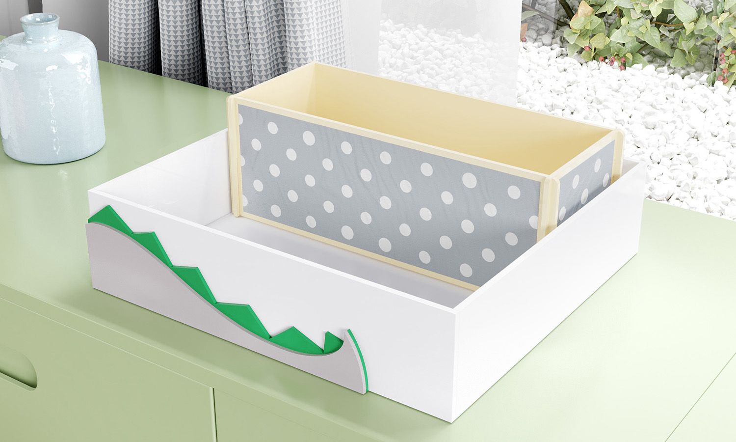 Para organizar a bancada de troca de fraldas e adicionar originalidade à decoração do quarto de bebê, conte com a praticidade da Bandeja MDF com Porta Fraldas Amiguinhos Dino. Esse modelo com design moderninho conta com uma divisória para colocar as fraldinhas e um lindo aplique de cauda de dinossauro. A estampa de bolinhas garante um toque descontraído e contemporâneo à peça, que pode ser usada depois para guardar pequenos objetos e brinquedos.
