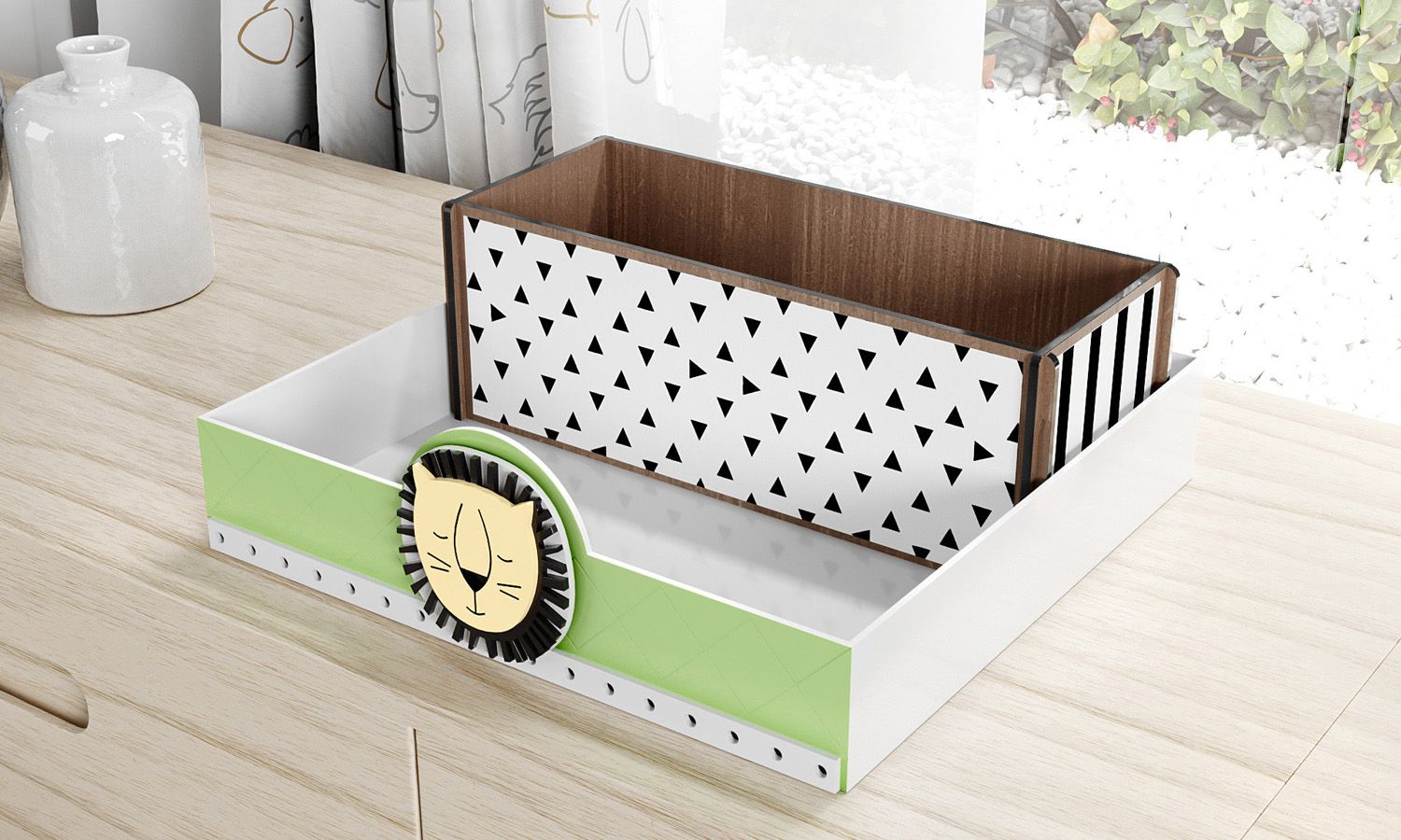 Para organizar a bancada de troca de fraldas e adicionar originalidade à decoração do quarto de bebê, conte com a praticidade da Bandeja MDF com Porta Fraldas Leão Amiguinhos da Floresta. Esse modelo com design moderninho conta com uma divisória para colocar as fraldinhas e um lindo aplique de leão delicadamente colorido com as cores do tema. Um mix de estampas geométricas garante um toque descontraído e contemporâneo à peça, que pode ser usada depois para guardar pequenos objetos e brinquedos.