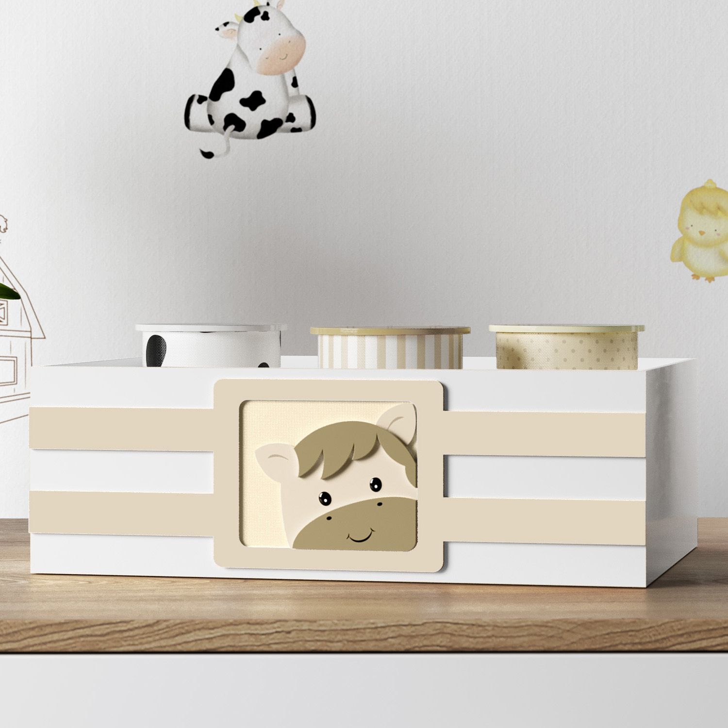 Guardar e organizar os objetos do bebê fica ainda melhor com a Bandeja MDF Amiguinho Cavalinho. A peça é confeccionada com a qualidade da madeira 100% MDF e seu design com cores neutras se destaca com um cavalinho em relevo aplicado.