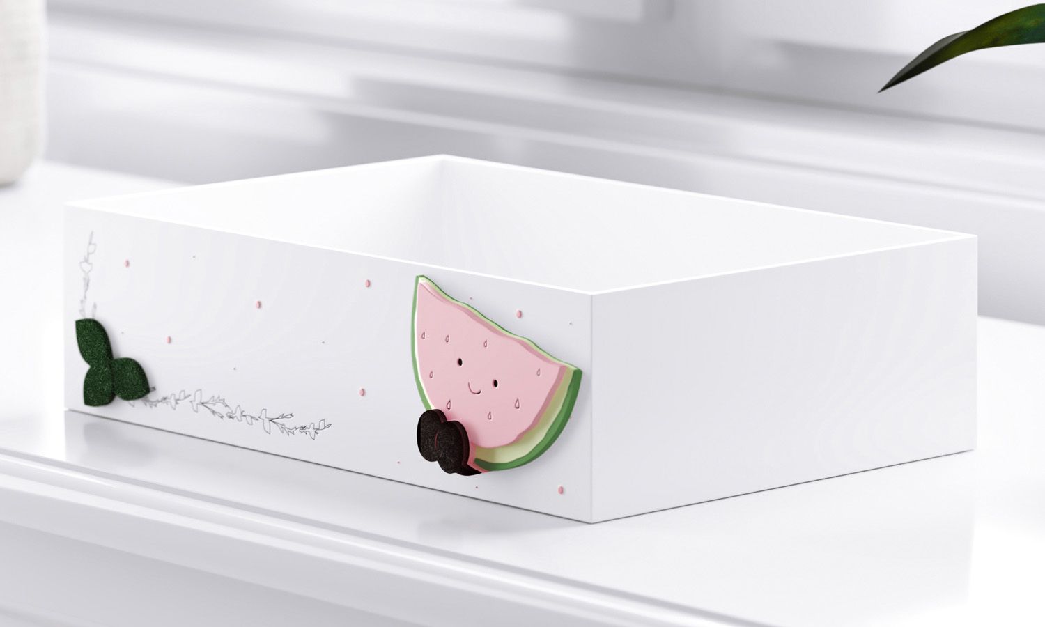Funcionalidade e graciosidade são algumas das características da Bandeja MDF Melancia Frutinhas. Ideal para o quarto de bebê, o acessório pode ser utilizado para guardar e organizar diversos objetos do seu amor! O diferencial dessa bandeja fica por conta de pequenas bolinhas cor-de-rosa pintadas à mão, detalhes gravados à laser, folhinhas de feltro e charmosos pezinhos!