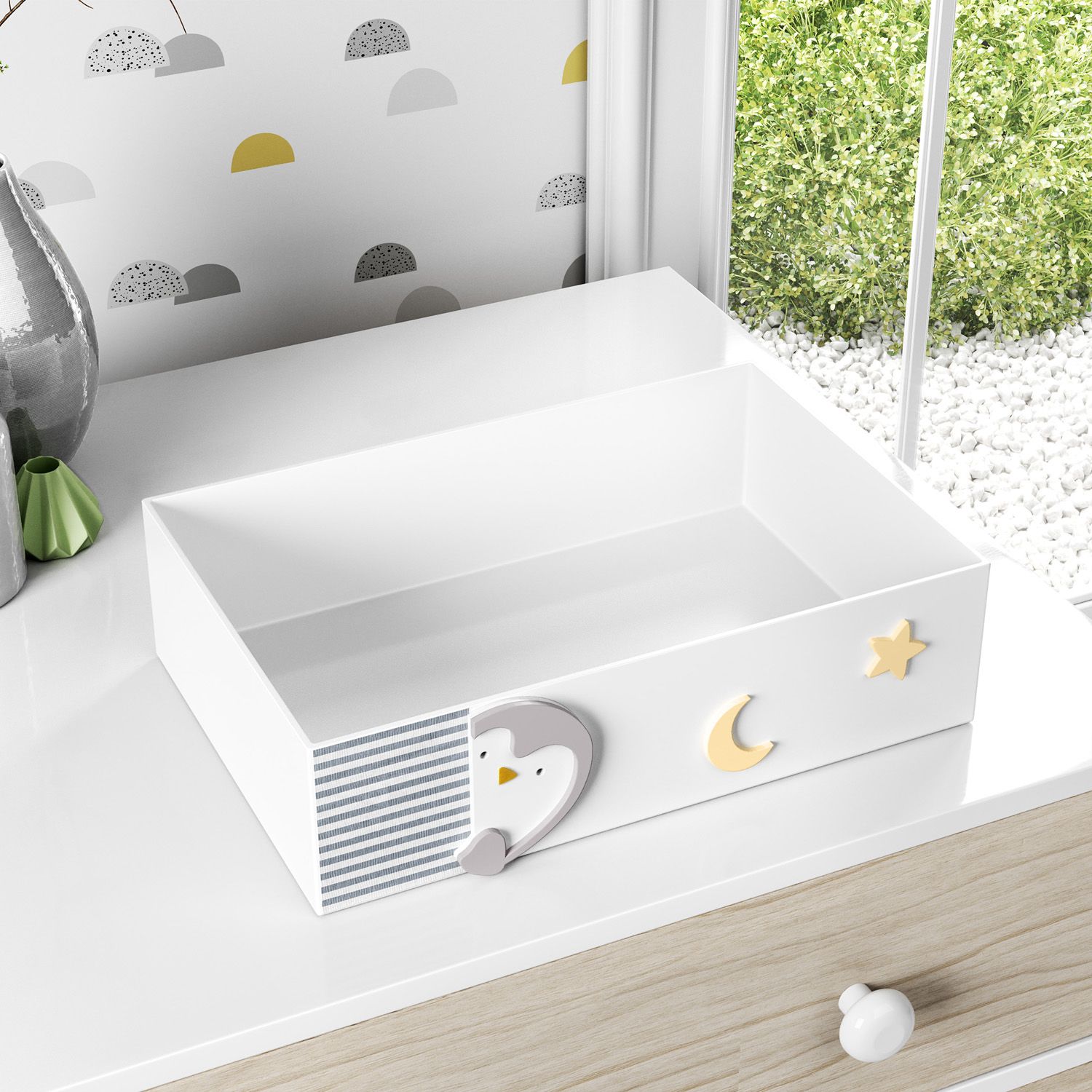 Produzida em madeira 100% MDF, a Bandeja Pinguim Estrelinha é uma linda opção para organizar e decorar o cantinho da troca de fraldas e o quarto de bebê. Você pode guardar potes, fraldinhas, pequenos brinquedos e medicamentos. O diferencial dessa peça exclusiva fica por conta do pinguim, a lua e a estrela aplicados na parte da frente.