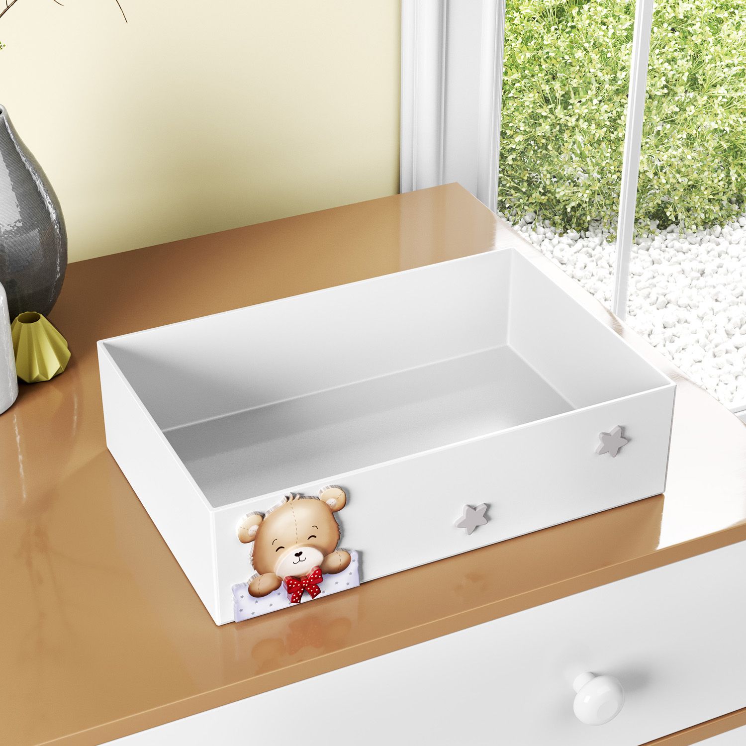 Produzida em madeira 100% MDF, a Bandeja Ursinho Vintage Poá e Estrela é uma linda opção para organizar e decorar o cantinho da troca de fraldas e o quarto de bebê. Você pode guardar potes, fraldinhas, pequenos brinquedos e medicamentos. O diferencial dessa peça exclusiva fica por conta do ursinho com laço de bolinhas aplicado na parte da frente.