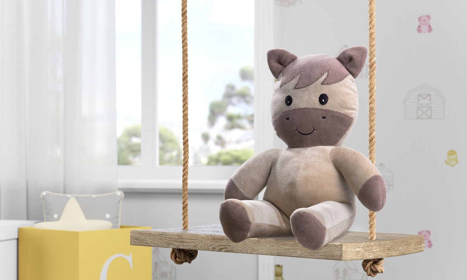 O Bichinho de Pelúcia Amiguinho Cavalinho 33cm decora o quarto de bebê Fazendinha com uma atmosfera lúdica e delicada.