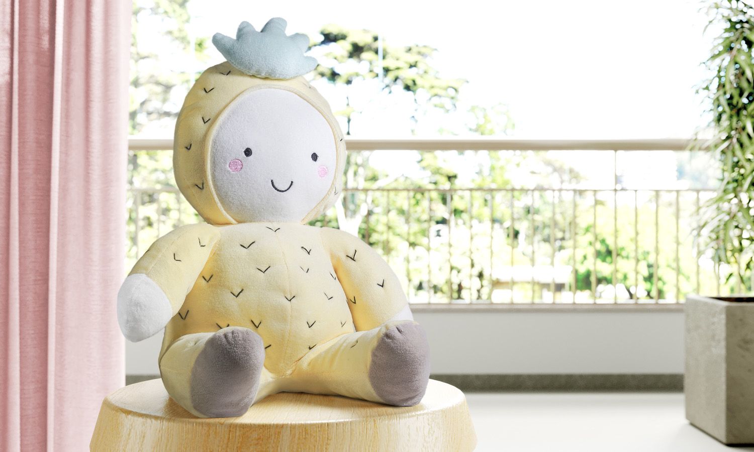 Essa pelúcia pode decorar berço, cama babá ou até nichos e prateleiras. Bordados da casca do abacaxi e um rostinho feliz são os detalhes que enfeitam seu design. O tecido plush e o enchimento tornam macio o contato com a pelúcia.