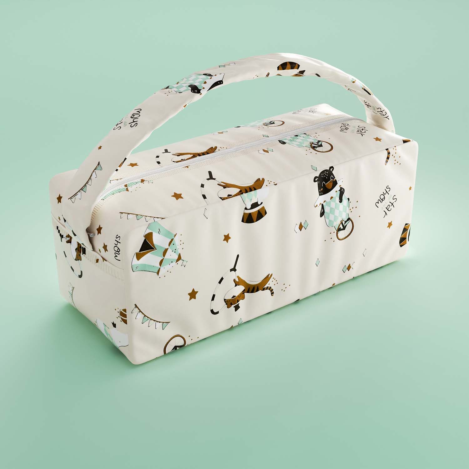 O acessório possui alça de mão e abertura por zíper, além de uma linda estampa para combinar com o tema do enxoval.