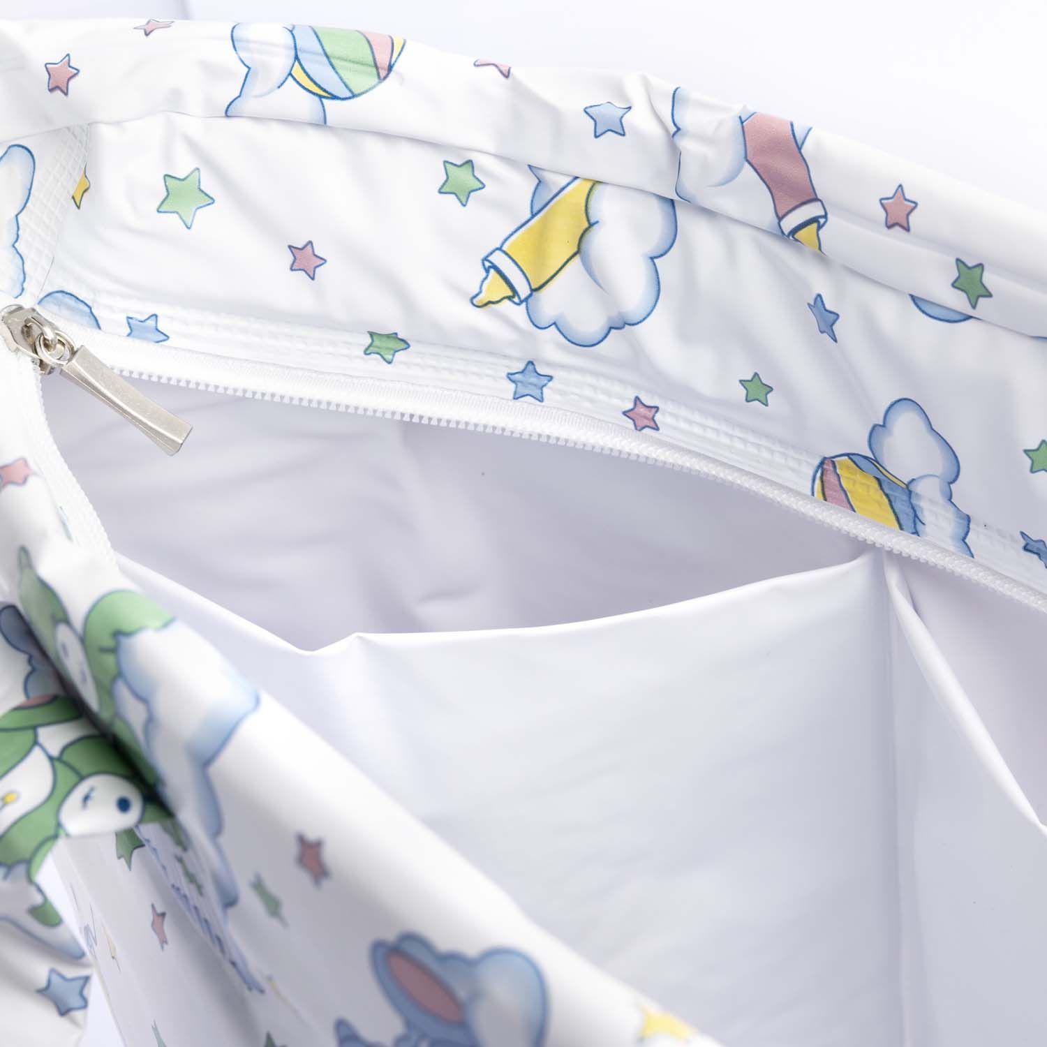 O acessório possui alça de mão e abertura por zíper, além de uma linda estampa para combinar com o tema do enxoval.