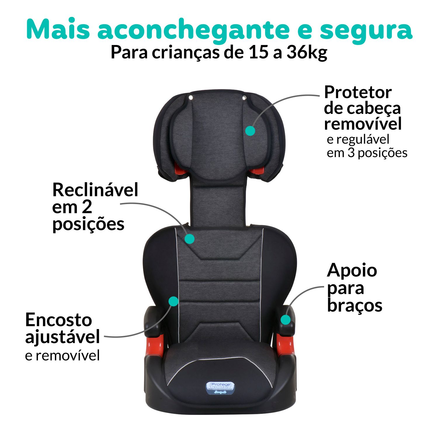 A cadeirinha conta com um novo sistema de inclinação localizado embaixo do assento, permitindo recliná-la em duas posições. Além disso, o acessório pode ser fixado ao banco pelo cinto de segurança do veículo, o que favorece o uso da cadeirinha por muito mais tempo, acompanhando o crescimento da criança. Também conta com apoio de cabeça regulável em 3 posições e seu revestimento em EVA protege o banco do veículo.
