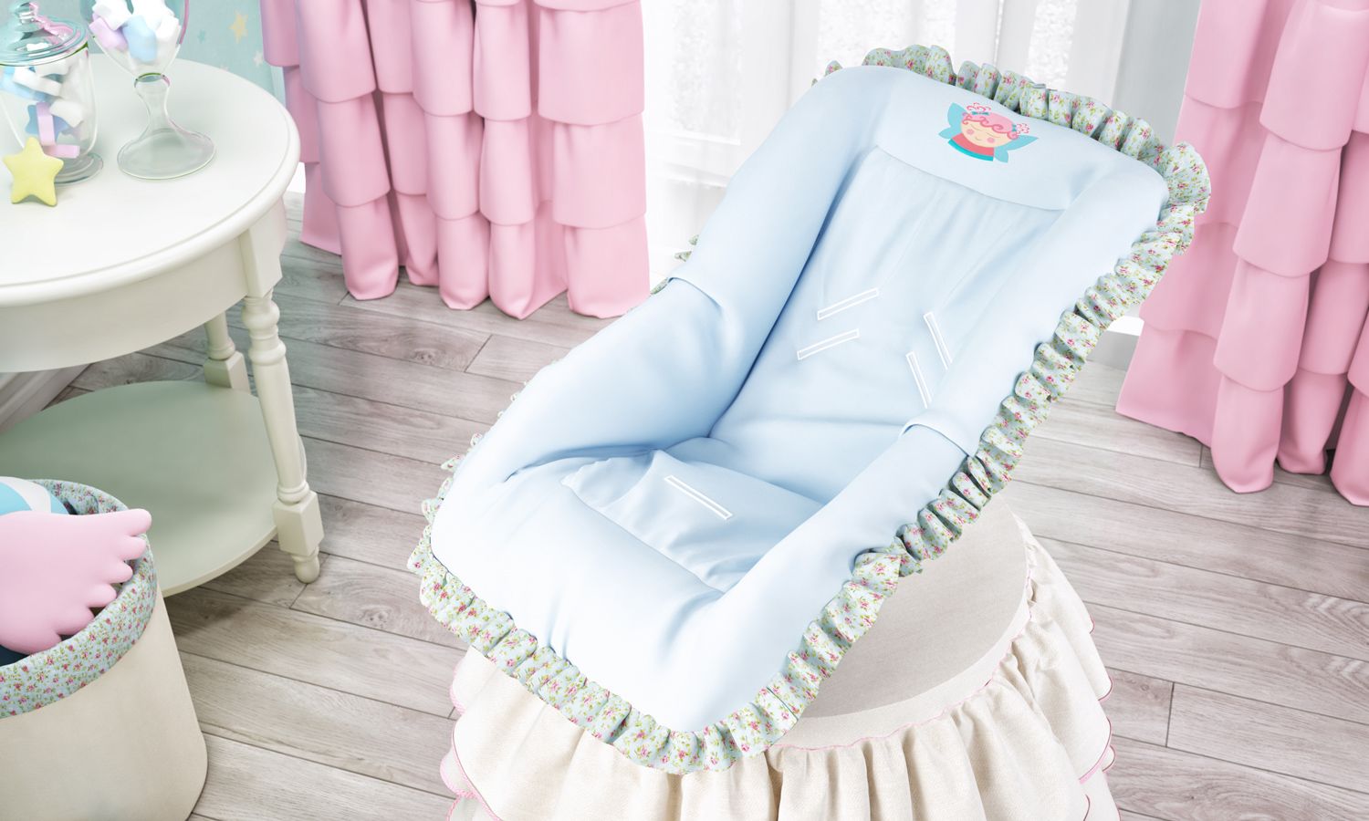 Para que os passeios em família ganhem uma porção extra de capricho e meiguice, criamos a Capa de Bebê Conforto da Coleção Fada! Um acessório único, confeccionado especialmente para preservar e proteger o estofado do carrinho de neném com um estilo romântico e repleto de encanto! Isso porque o azul bebê toma conta do acessório, composto por um babadinho floral e uma singela fadinha, que rouba a cena num bordado exclusivo! Para garantir o conforto e segurança da pequena, esse modelo exclusivo é confeccionado com tecido macio e espaço para passar o cinto de segurança. Aproveite e conheça todos os produtos de decoração do quarto de bebê e enxoval da Coleção Fada!