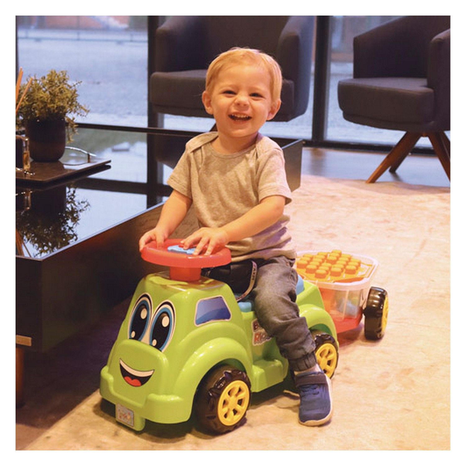 Com quatro rodas, o acessório tem ainda volante com buzina e trailer com peças de encaixe para divertir ainda mais os pequenos.