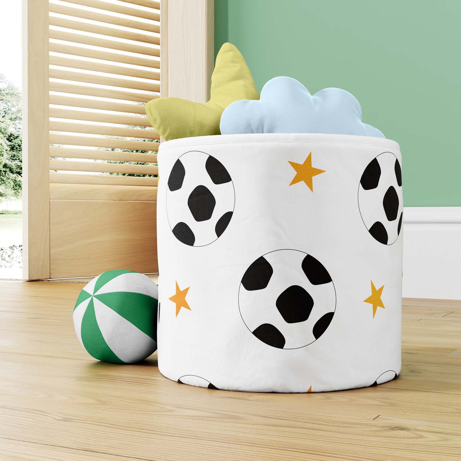 Versátil e encantador, o acessório é estruturado e revestido com uma estampa lúdica de bolas de futebol e estrelas. O cesto é perfeito para decorar e manter cada coisa em seu lugar com muito estilo no quarto de bebê e infantil.