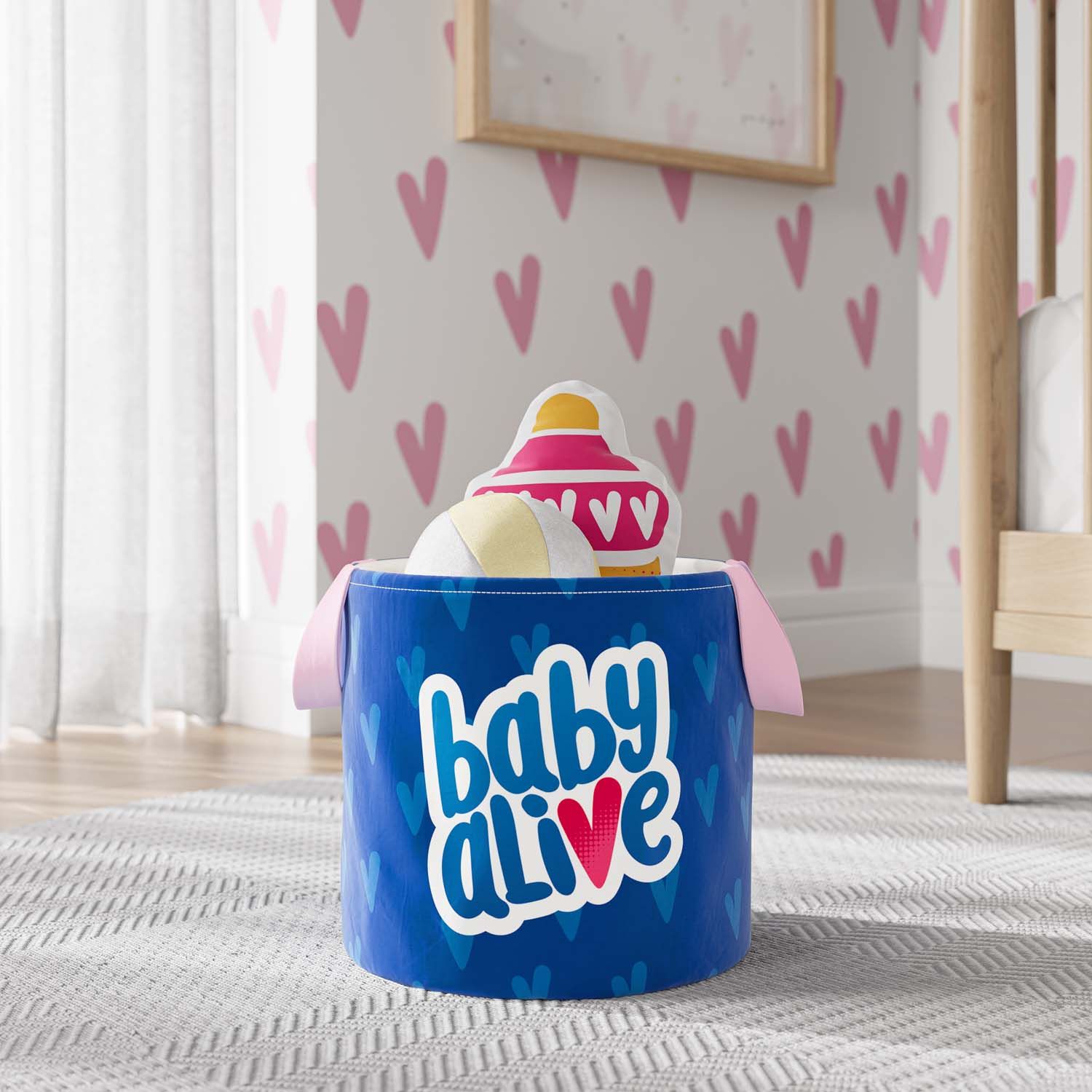 Versátil e encantador, o acessório capricha na criatividade, já que é estruturado e revestido com estampa oficial da Baby Alive, além de possuir alças que facilitam o transporte pela casa. Uma forma funcional e divertida de evitar a bagunça e decorar o ambiente com toda a fofura!