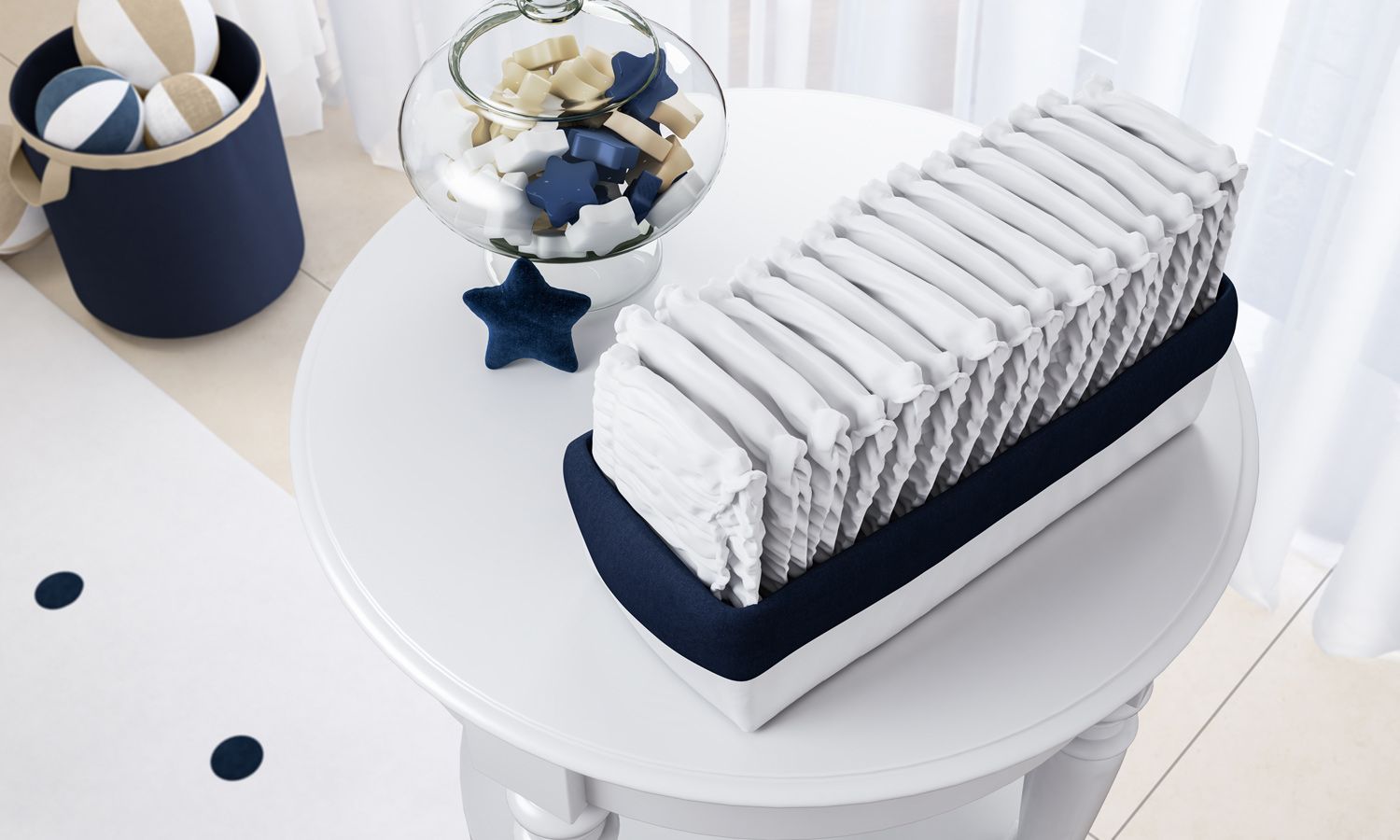 Para manter a organização do quarto de bebê, surge o Cesto Organizador Multiuso! Em uma fina confecção com enchimento de espuma, a peça, de 40 cm, é perfeita para guardar as fraldinhas do recém-nascido, deixando-as sempre à mão! Esse modelo exclusivo ainda embeleza o ambiente com o estilo clássico, que transparece na suavidade do tecido branco e na borda azul-marinho.
