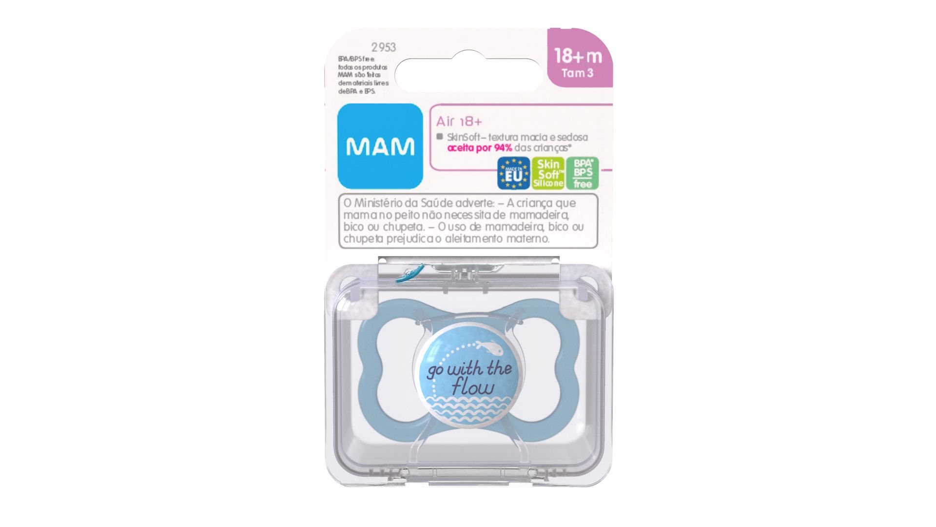 A Chupeta Air (18M+) Mam foi desenvolvida para crianças de 18M+, ela possui um disco ventilado desenhado para permitir a circulação do ar e evitando que a criança fique com vermelhidão e com a boca molhada. Seu bico é de silicone macio, texturizada e sedosa, comprovadamente aceita por 94% das crianças.