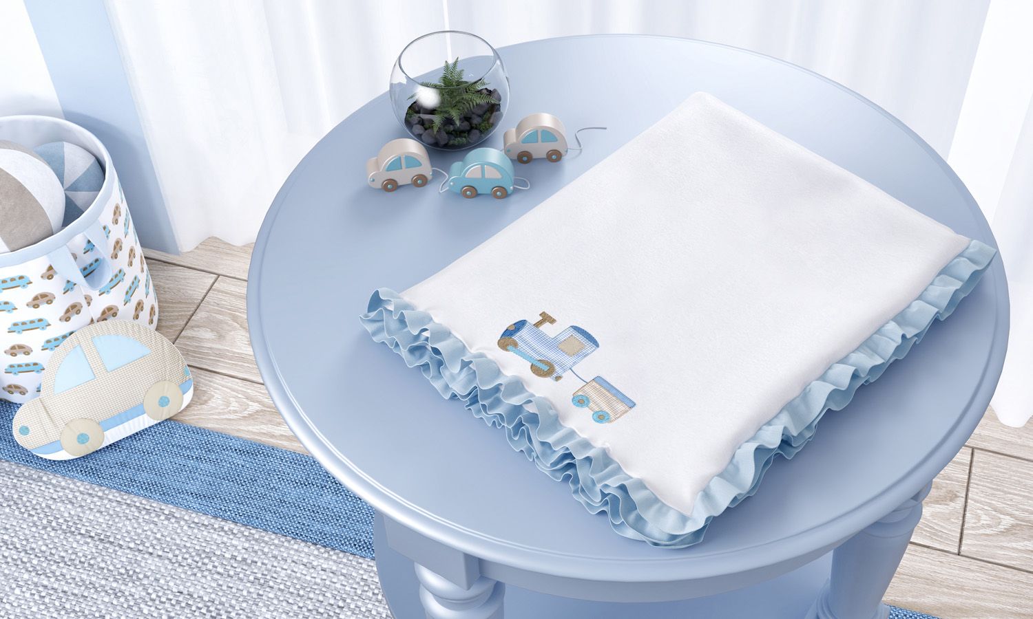 Como num toque de carinho da mamãe, a Manta Soft Carrinhos embala seu menino no maior aconchego! Indicado para os recém-nascidos, o tecido soft aquece o bebê no mais rigoroso inverno e enrola o pequeno com o conforto que ele merece — assim, o bem-estar do seu maior amor estará mais do que garantido! Exclusivo, esse modelo conta com um babado azul e o charmoso bordado de trenzinho, que ganhou o belíssimo detalhe da estampa xadrez.