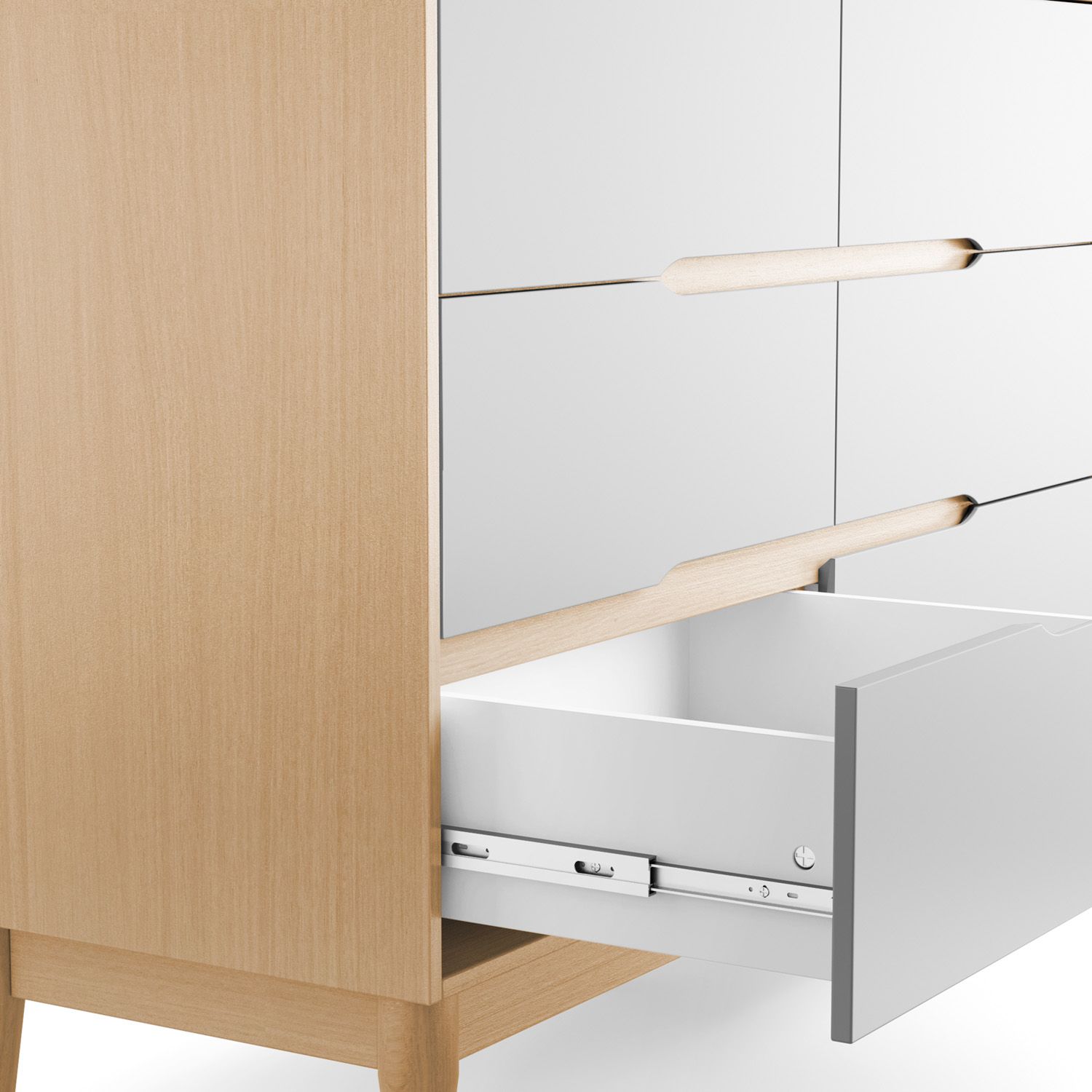 Esse móvel tem amplo espaço nas gavetas, onde podem ser acomodadas todas as peças do enxoval ou produtos de cuidados diários. A superfície também serve de apoio para trocador de fraldas já que além do espaço, dispõe de pintura atóxica. Confira todos os detalhes: