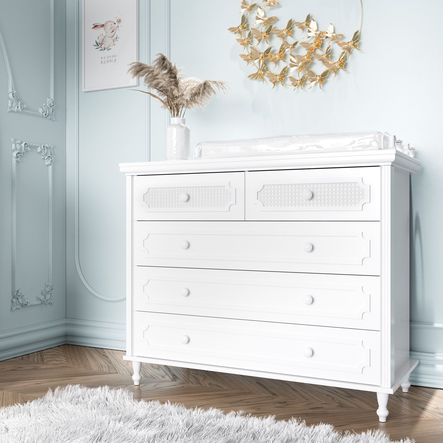 A elegância da Cômoda Infantil Branco Classic vai transformar a decoração do quarto de bebê com seu visual impecável! Um móvel sofisticado com detalhes torneados e design clássico com tela Rattan, sinônimo de delicadeza com inspiração clássica. Produzida em MDF de alta resistência, essa cômoda possui amplo espaço para fraldário, enxoval e roupinhas. Confira todos os detalhes: