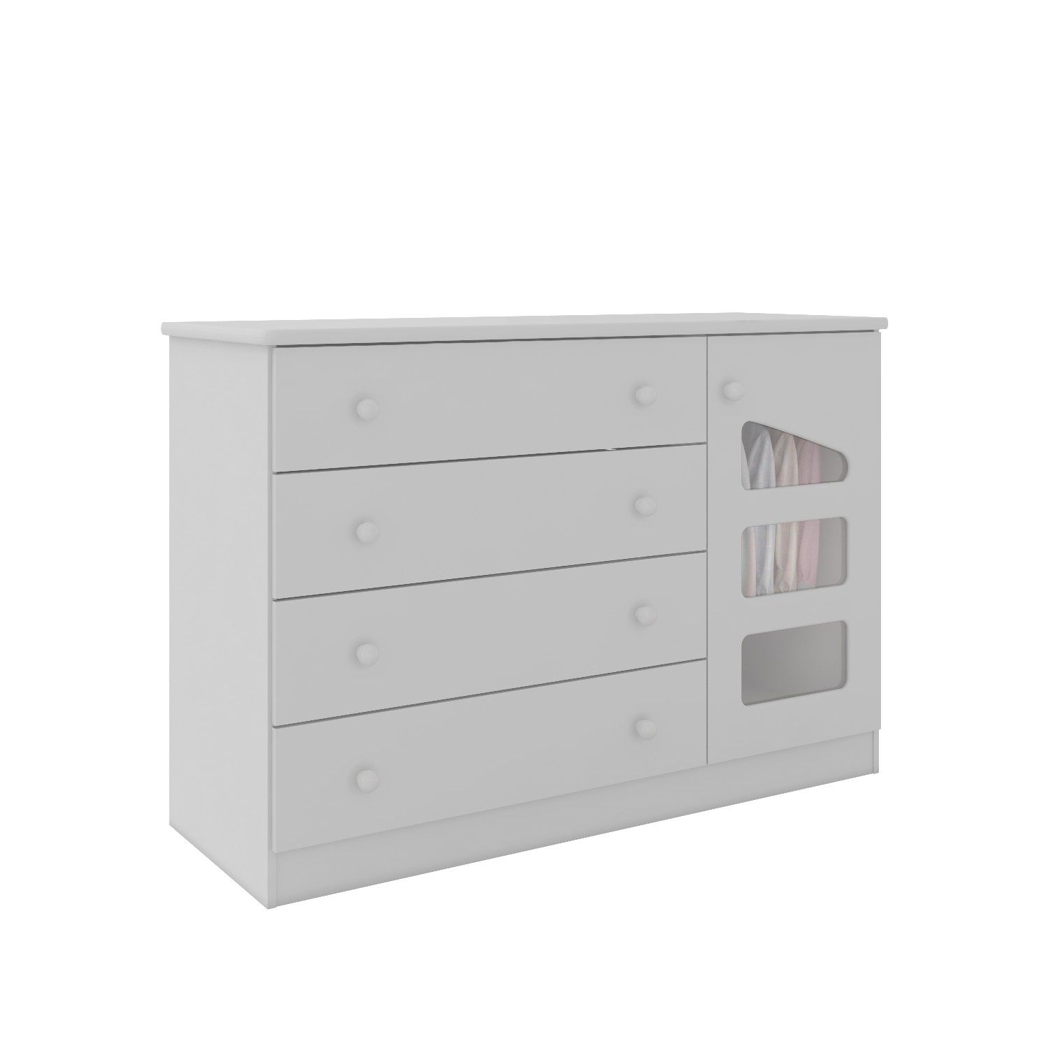 Com quatro gavetas e uma porta com detalhes em acrílico, o móvel é um importante aliado na organização do quartinho. Seu amplo espaço interno permite armazenar boa parte das peças de uso diário do enxoval.
