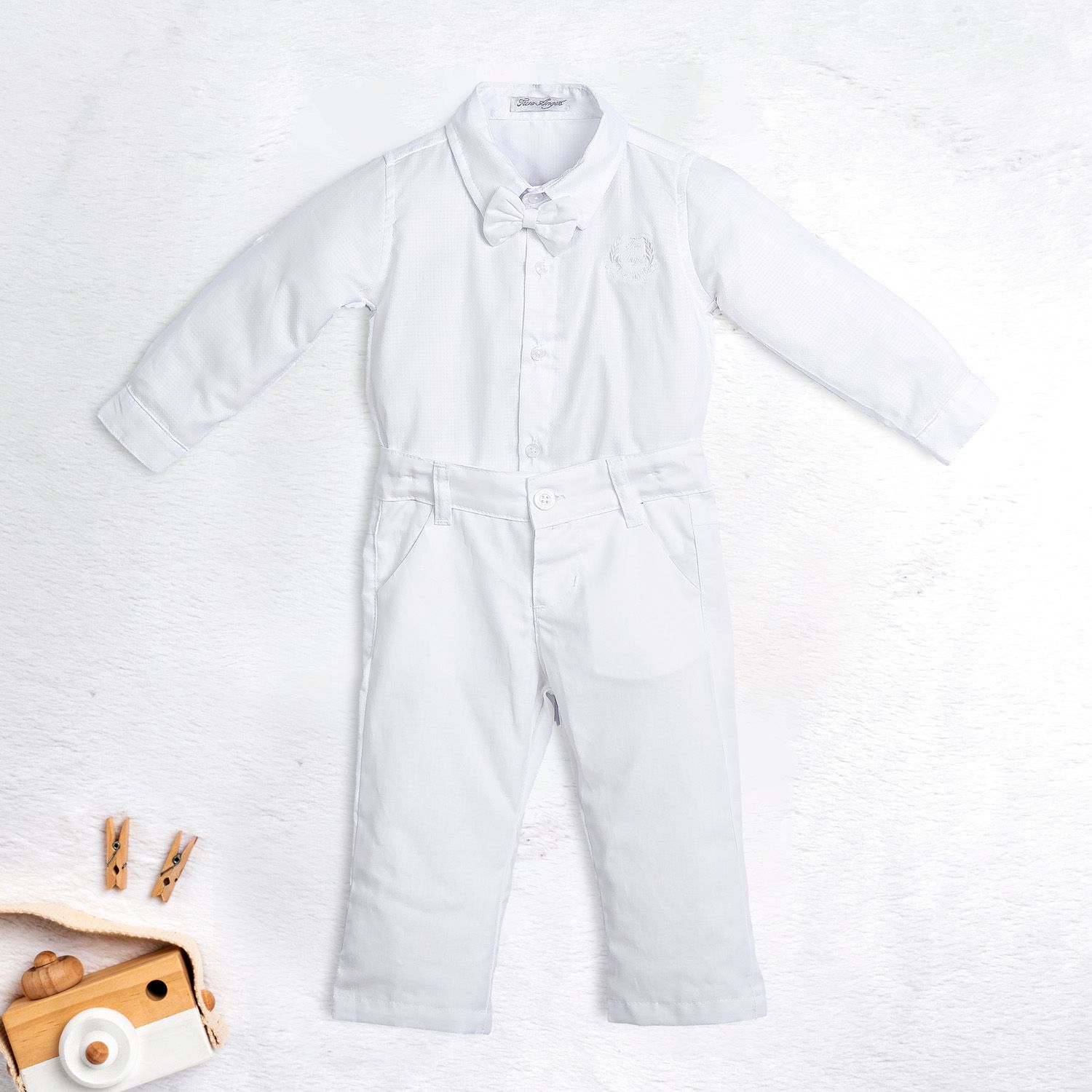 Disponível do 0m aos 24m, o conjunto está disponível em duas cores: branco e marfim. Especialmente para o seu bebê ficar ainda mais lindo! O Conjunto Batizado Body Manga Longa e Calça 0m - RN é a opção mais sofisticada para vestir seu bebê com conforto e delicadeza para casamentos, batizados e eventos especiais. O conjunto é composto por três peças: body de manga longa em tecido 100% algodão, calça de linho com elástico e ajuste na cintura e gravata borboleta branca.