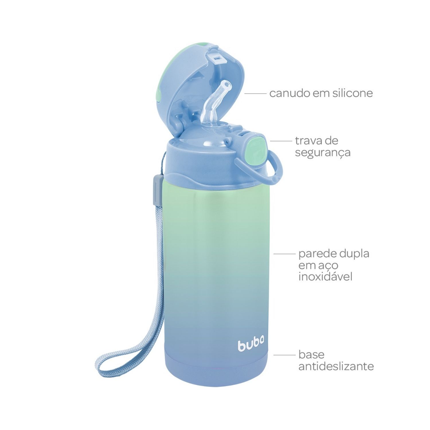Conta ainda com cordinha antiqueda, trava de segurança para evitar vazamentos e canudo de silicone retrátil, que fica protegido quando a tampa é fechada, garantindo praticidade e higiene.
