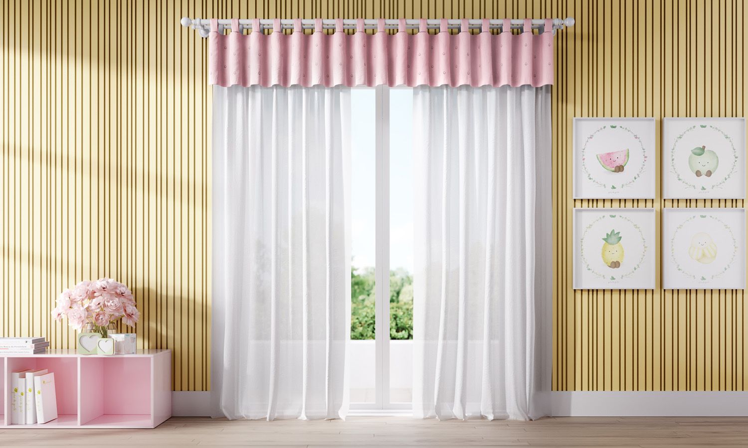 A Cortina Bordada Melancia Rosa traz a delicadeza da cor rosa e as sementes bordadas que inspiram as sementes da melancia da coleção Frutinhas.